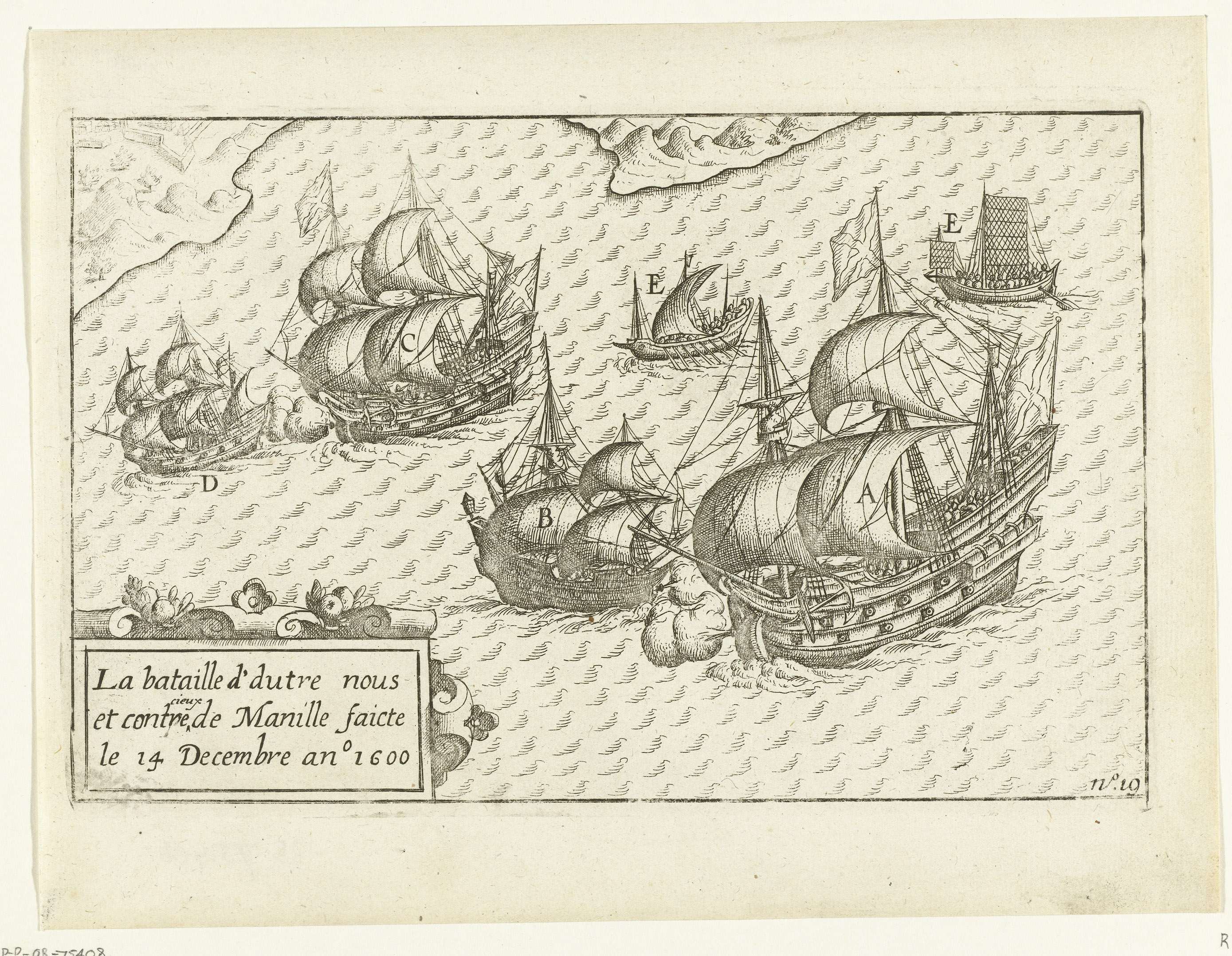 Gevecht met Spaanse schepen in de baai van Manila, 14 december 1600. Onderdeel van de illustraties in het verslag van de reis om de wereld door Olivier van Noort in 1598-1601. No. 19.