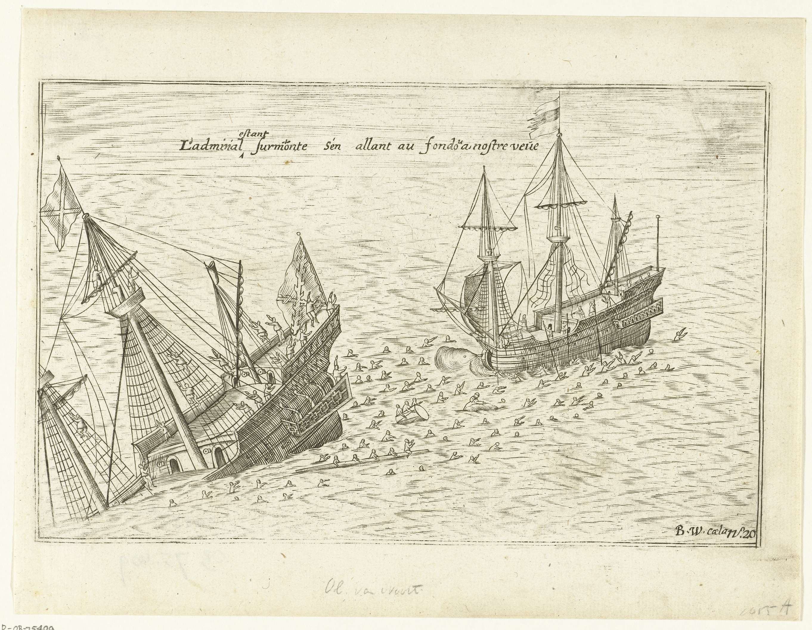 De Mauritius zinkt het Spaanse schip tijdens het gevecht in de baai van Manila, 14 december 1600. De opvarenden van het Spaanse schip proberen zich zwemmend te redden. Onderdeel van de illustraties in het verslag van de reis om de wereld door Olivier van Noort in 1598-1601. No. 20.