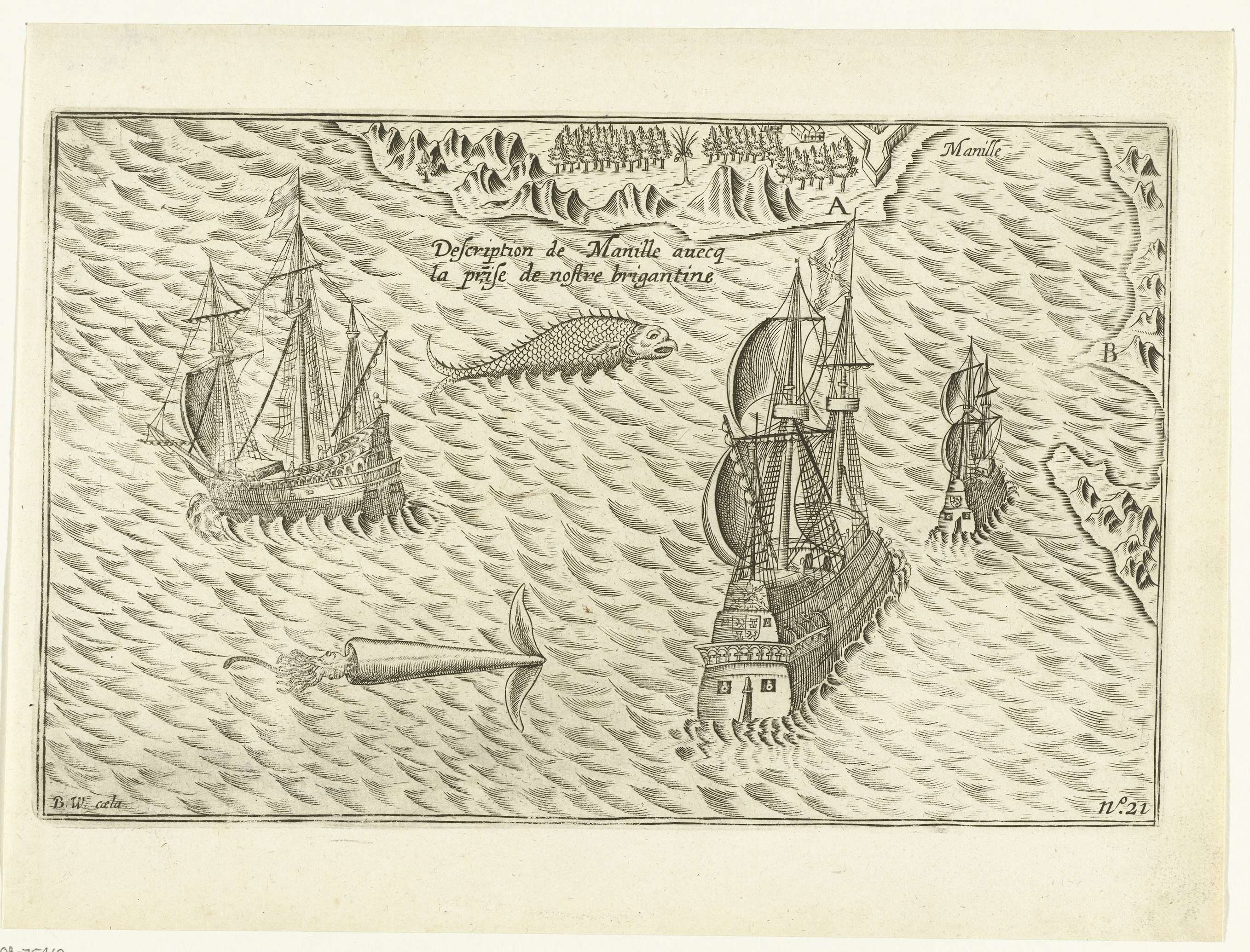 De Mauritius ontmoet bij Manila een Spaans schip met het buitgemaakte Hollandse jacht, 15 december 1600. In het water een groet vis en een reuzenpijlinktvis. Onderdeel van de illustraties in het verslag van de reis om de wereld door Olivier van Noort in 1598-1601. No. 21.