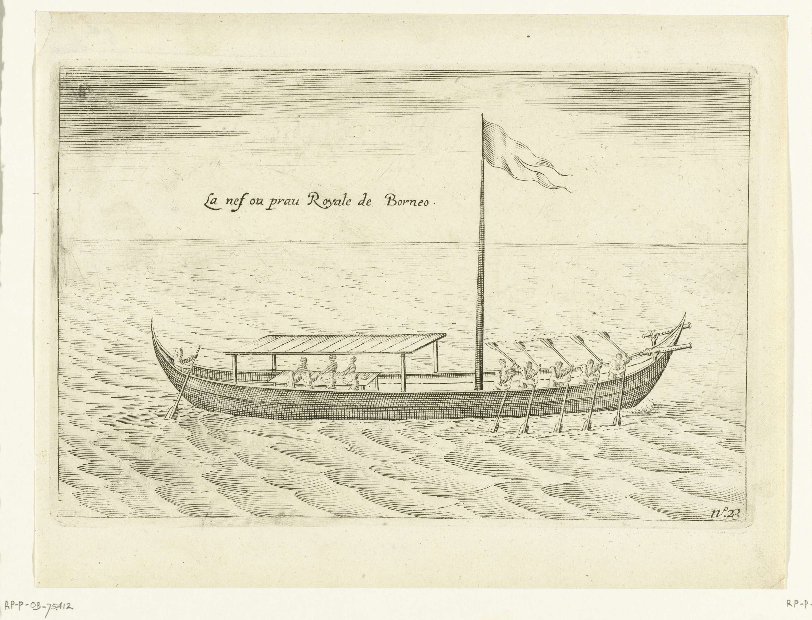 De koninklijke prauw of galei van de koning van Borneo, 1 januari 1601. Onderdeel van de illustraties in het verslag van de reis om de wereld door Olivier van Noort in 1598-1601. No. 23.