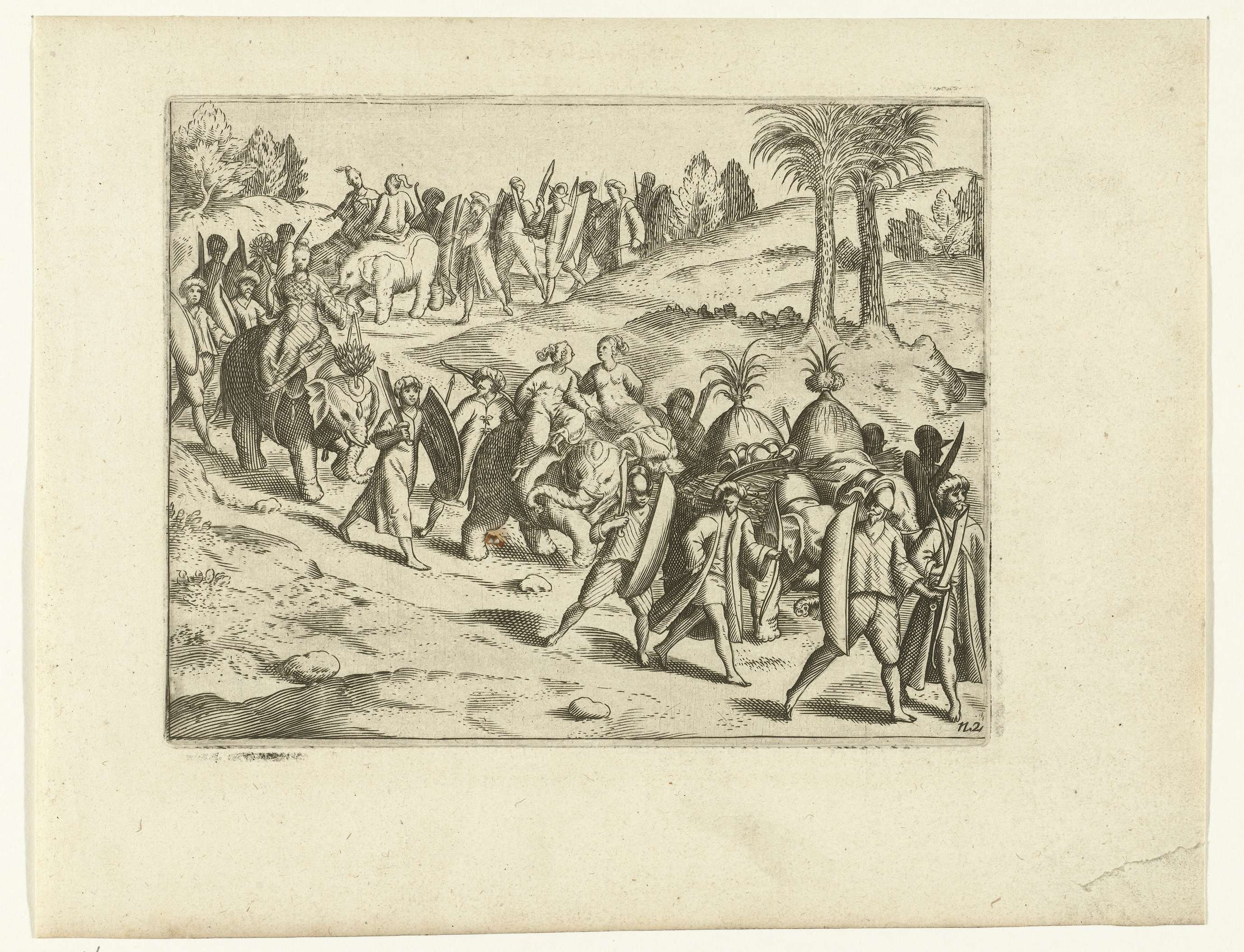 Optocht van de koningin van Pattani, 24 juni 1602. Optocht van de koningin van Patane (Pattani) met haar gevolg van hofdames rijdend op een olifanten, met gewapende escorte te voet. Onderdeel van de illustraties in het verslag van de tweede reis van Jacob van Neck naar Oost-Indië in 1600-1604. No. 2.