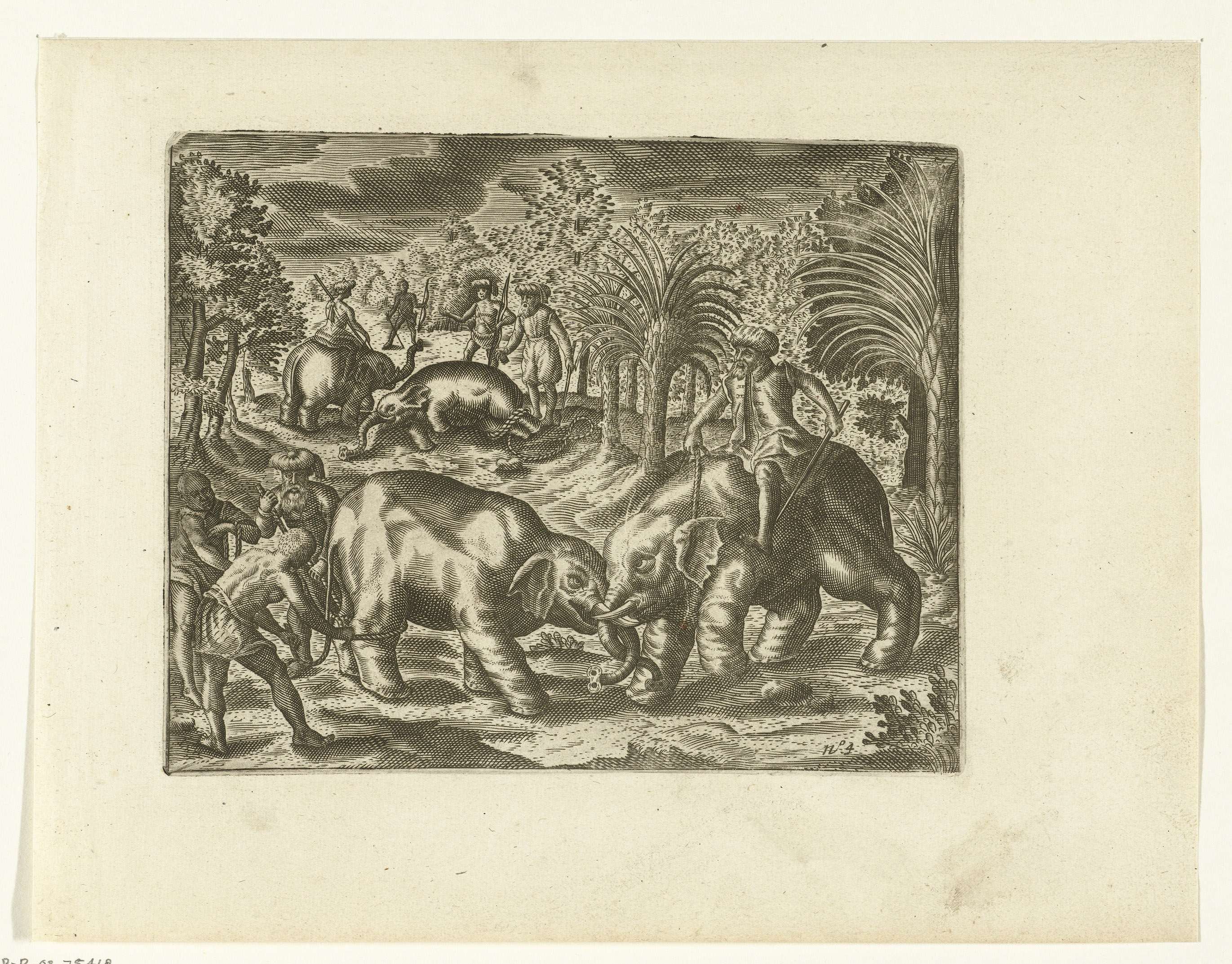 De manier om olifanten te vangen en te temmen op Pattani, 1602. Op de voorgrond twee vechtende olifanten, de achterpoten van het wilde dier worden vastgebonden. Onderdeel van de illustraties in het verslag van de tweede reis van Jacob van Neck naar Oost-Indië in 1600-1604. No. 4.