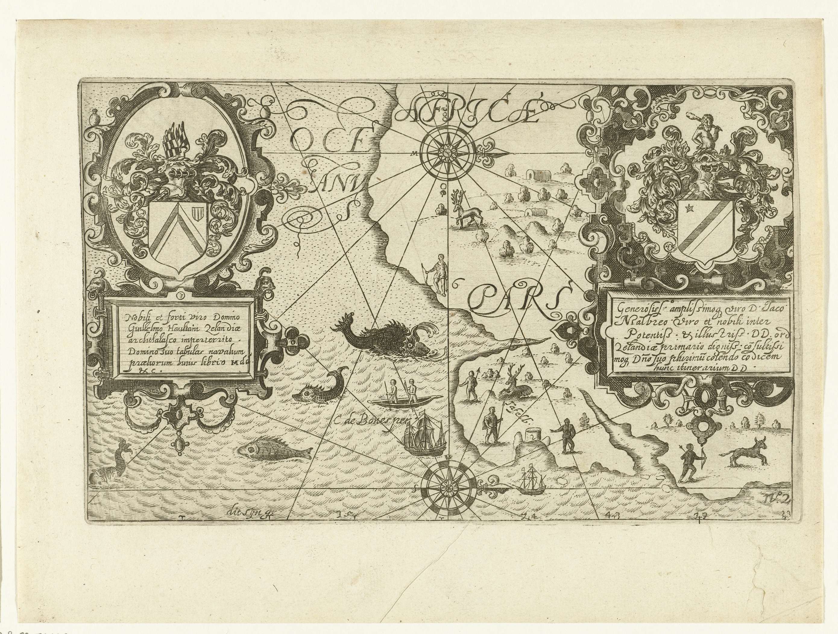Kaart van Kaap de Goede Hoop, de Tafelbaai en Tafelberg, november 1601. De prent is opgedragen aan Jacques de Malderé en Willem de Zoete, heer van Haultain, hun wapens staan rechts en links in de voorstelling, met motto en opdracht in het Latijn. Spiegelbeeldige kopieën naar de oorspronkelijke illustraties van Floris Balthasarsz. van Berckenrode in ...