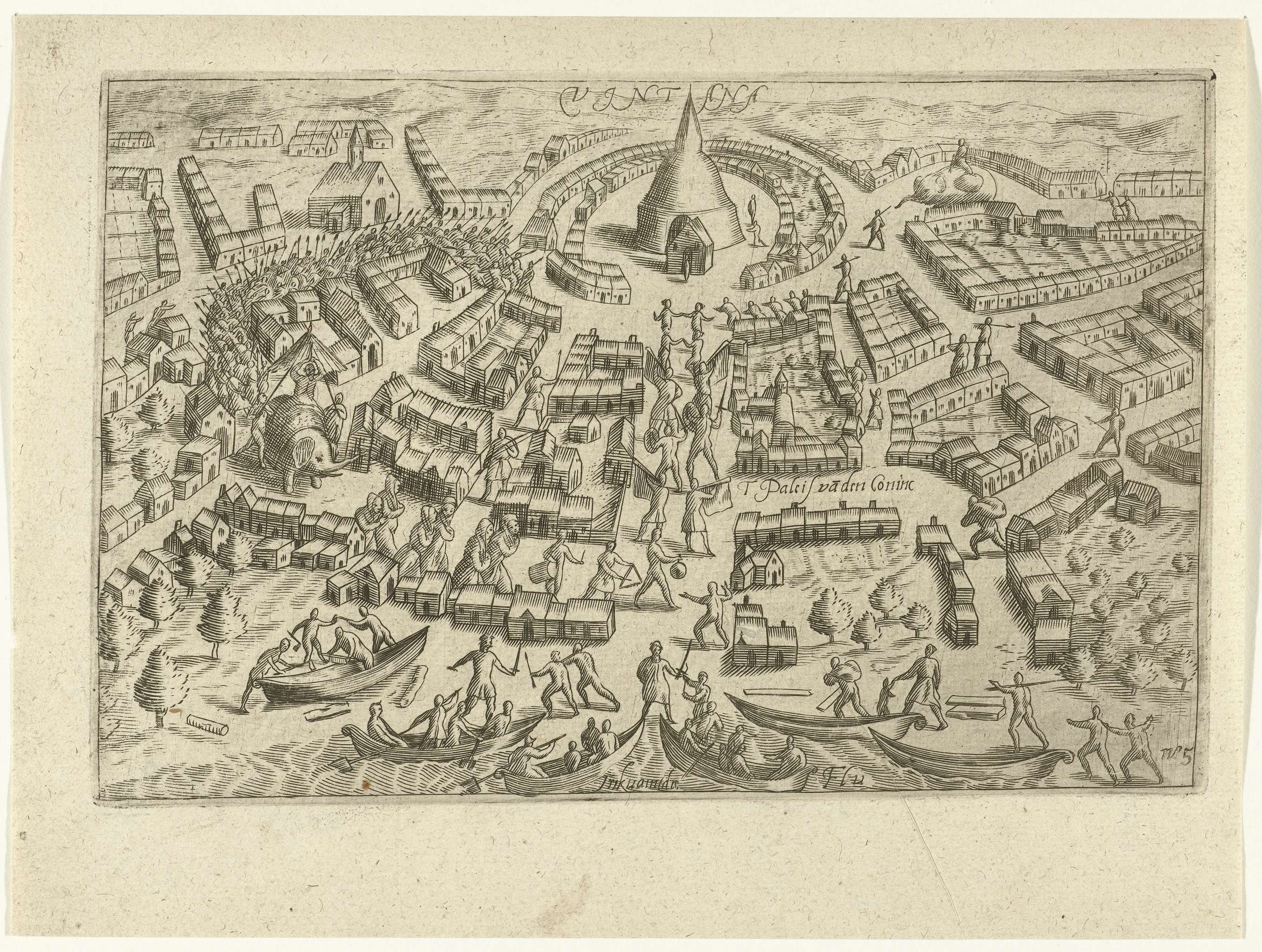 Bezoek aan de stad Vintana in de buurt van Kandy op Ceylon, juli 1602. Onderaan de aankomst van de sloepen met de Nederlanders bij de stad. In het centrum een tempel. Spiegelbeeldige kopieën naar de oorspronkelijke illustraties van Floris Balthasarsz. van Berckenrode in het verslag van de reis van Joris van Spilbergen naar Oost-Indië in ...