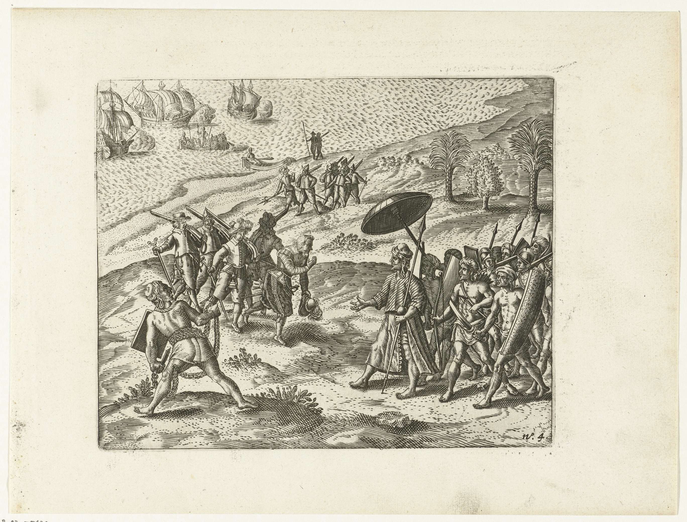 Vice-admiraal De Weert ontvangen door de koning van Batticaloa (Maticalo) op Ceylon, 30 april 1603. Op de voorgrond vertoont een gochelaar zijn kunsten. Onderdeel van de illustraties in het verslag van de eerste reis naar Oost-Indië voor de VOC onder Van Warwyck en De Weert in 1602, No. 4.