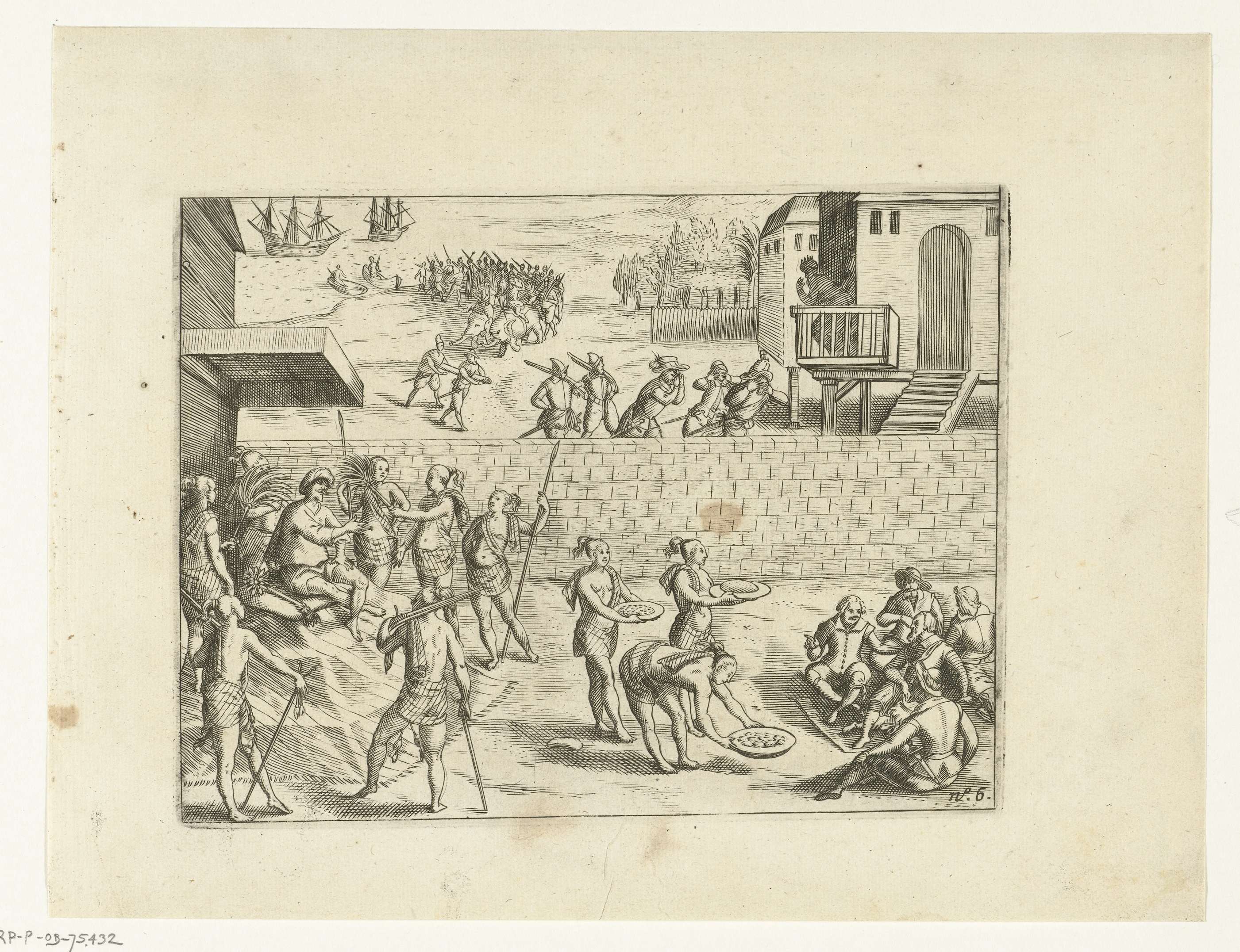 De prins van Atjeh ontvangt de Hollanders, 16 augustus 1603. De Hollanders zitten op de grond en krijgen eten aangereikt. De prins heeft een lijfwacht van gewapende vrouwen. Onderdeel van de illustraties in het verslag van de eerste reis naar Oost-Indië voor de VOC onder Van Warwyck en De Weert in 1602, No. 6.