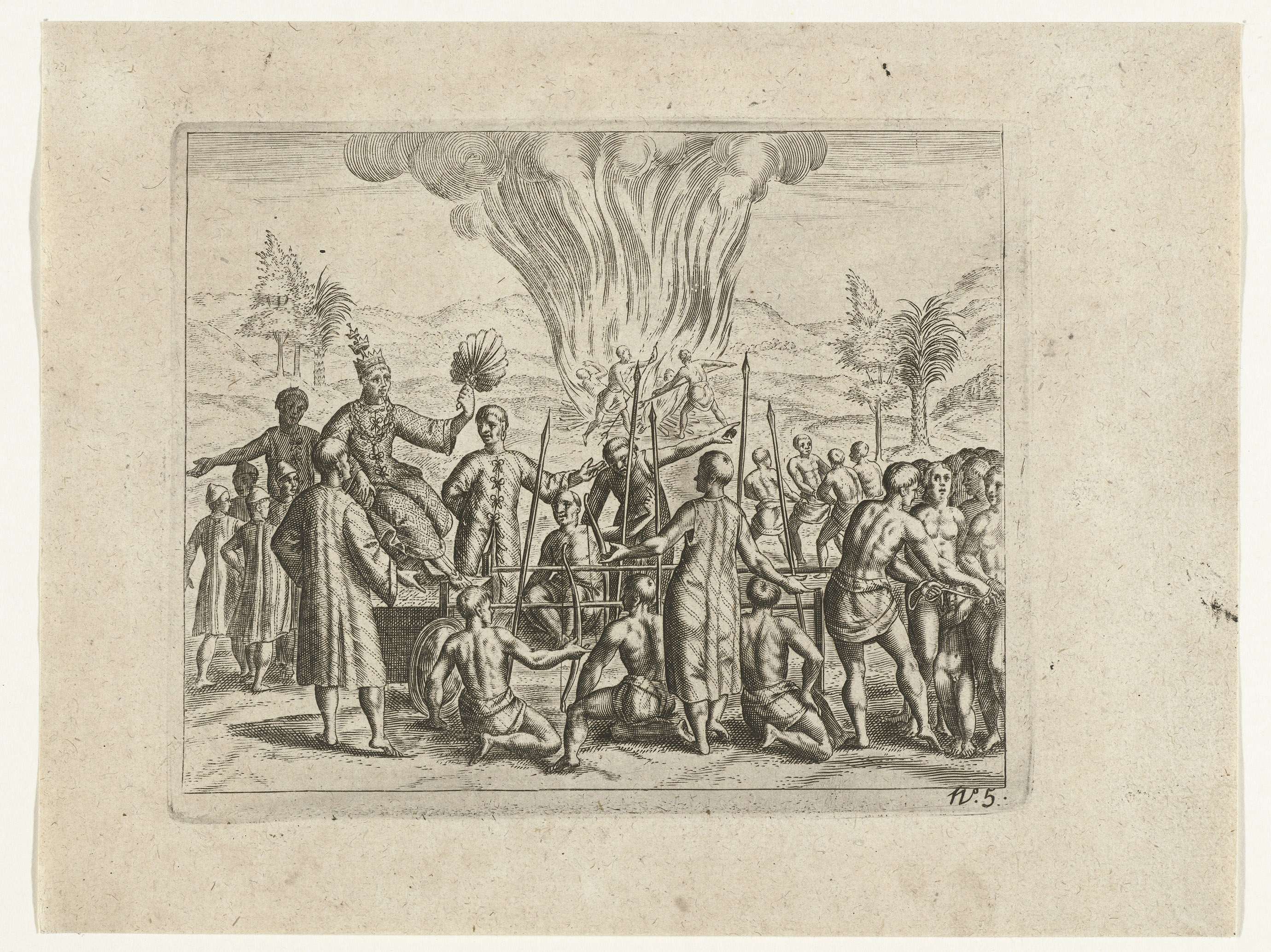 De koning van Pegu laat een groep van zijn edelen met hun vrouwen en kinderen boeien en levend verbranden, wegens verraad. 1604. Links de koning zittend op een kar. Onderdeel van de illustraties in het verslag van de tweede reis naar Oost-Indië voor de VOC onder Steven van der Hagen, 1603-1608, No. 5.
