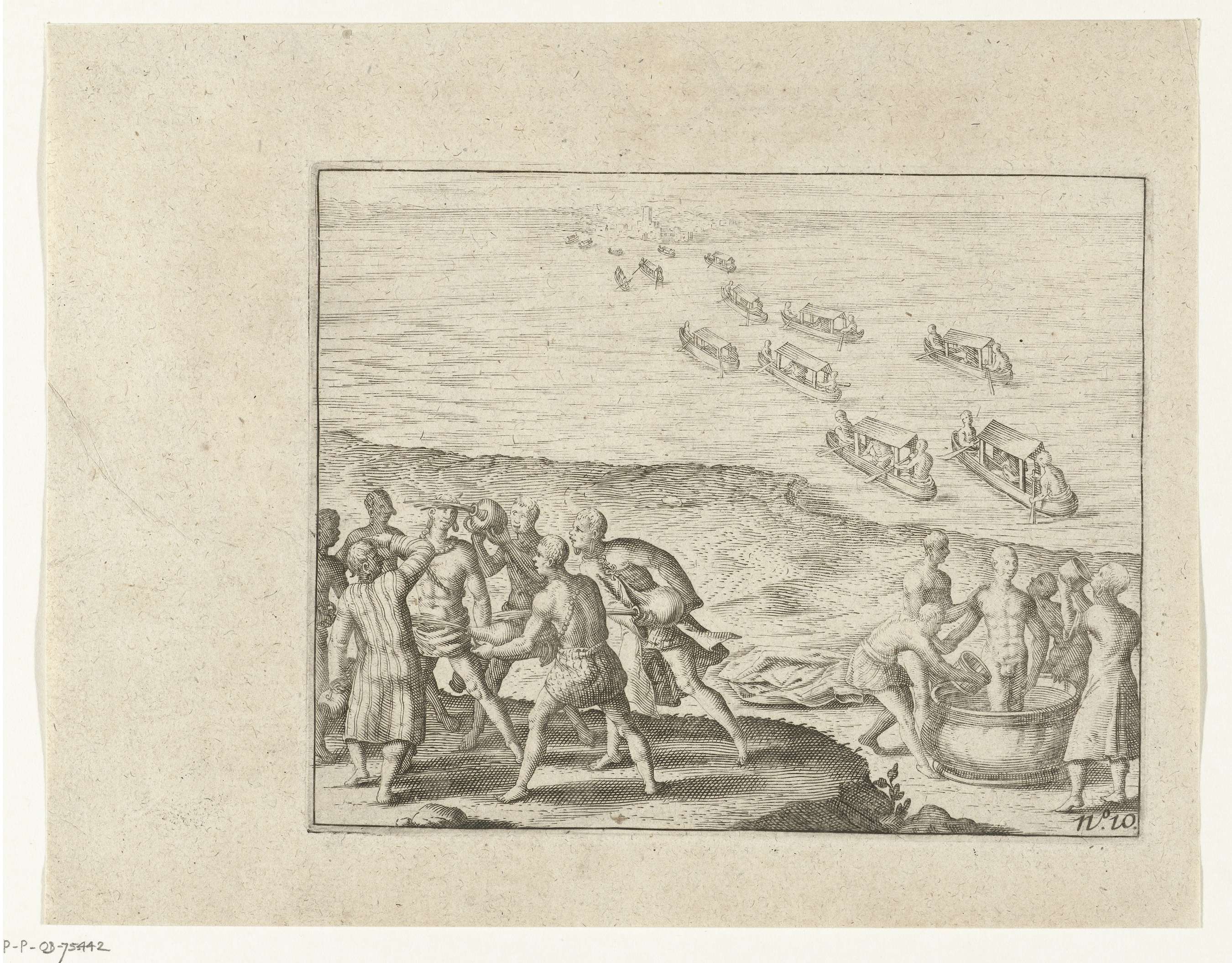 Feestceremoniën te Pegu tijdens het feest van Sapan Daiche, een waterfeest, 1604. De koning van Pegu laat zich wassen en besproeien met reukwater. Onderdeel van de illustraties in het verslag van de tweede reis naar Oost-Indië voor de VOC onder Steven van der Hagen, 1603-1608, No. 10.