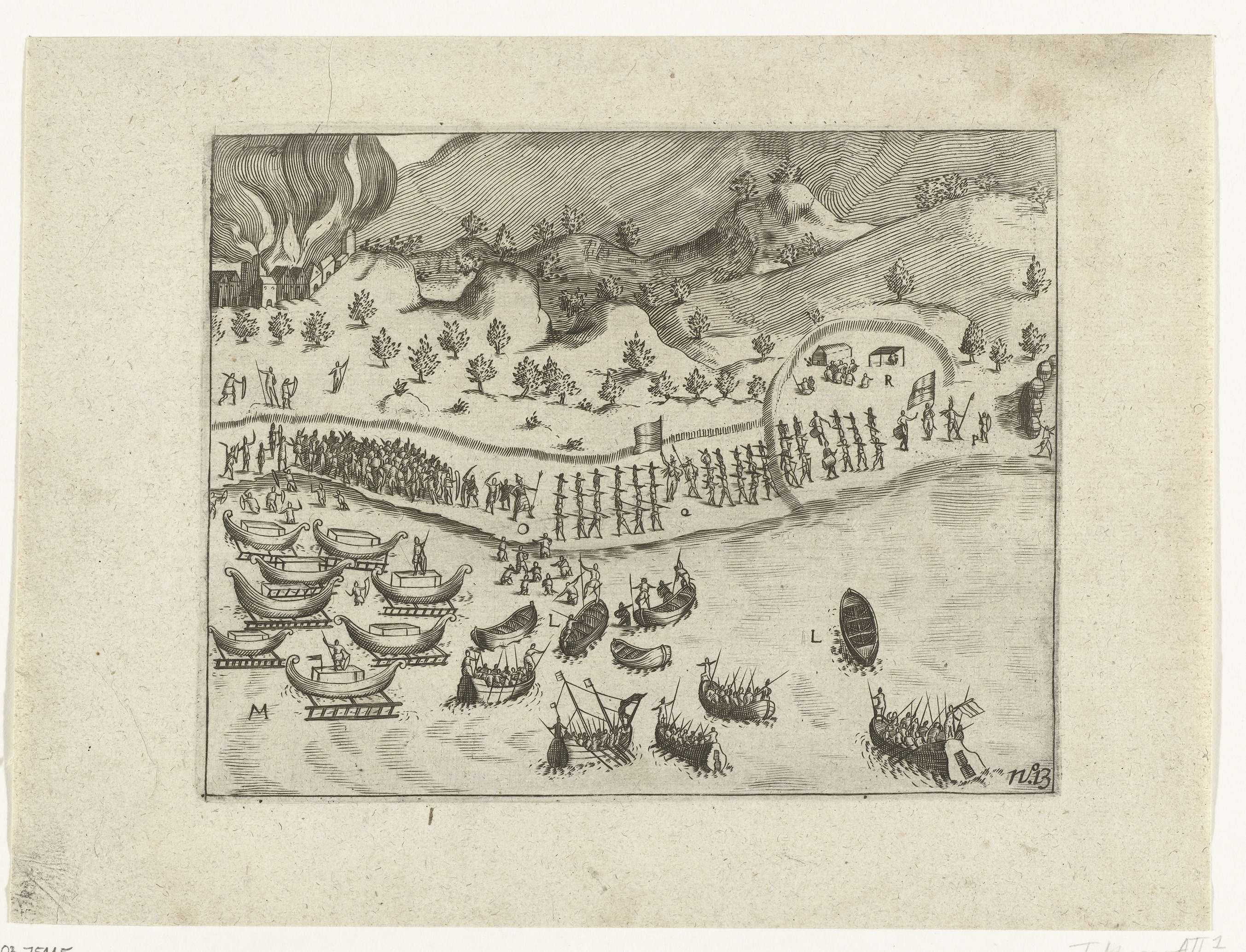 Bestorming en verovering van het fort van Tidore op de Portugezen door de Hollanders, 14 mei 1605. Onderdeel van de illustraties in het verslag van de tweede reis naar Oost-Indië voor de VOC onder Steven van der Hagen, 1603-1608, No. 13.