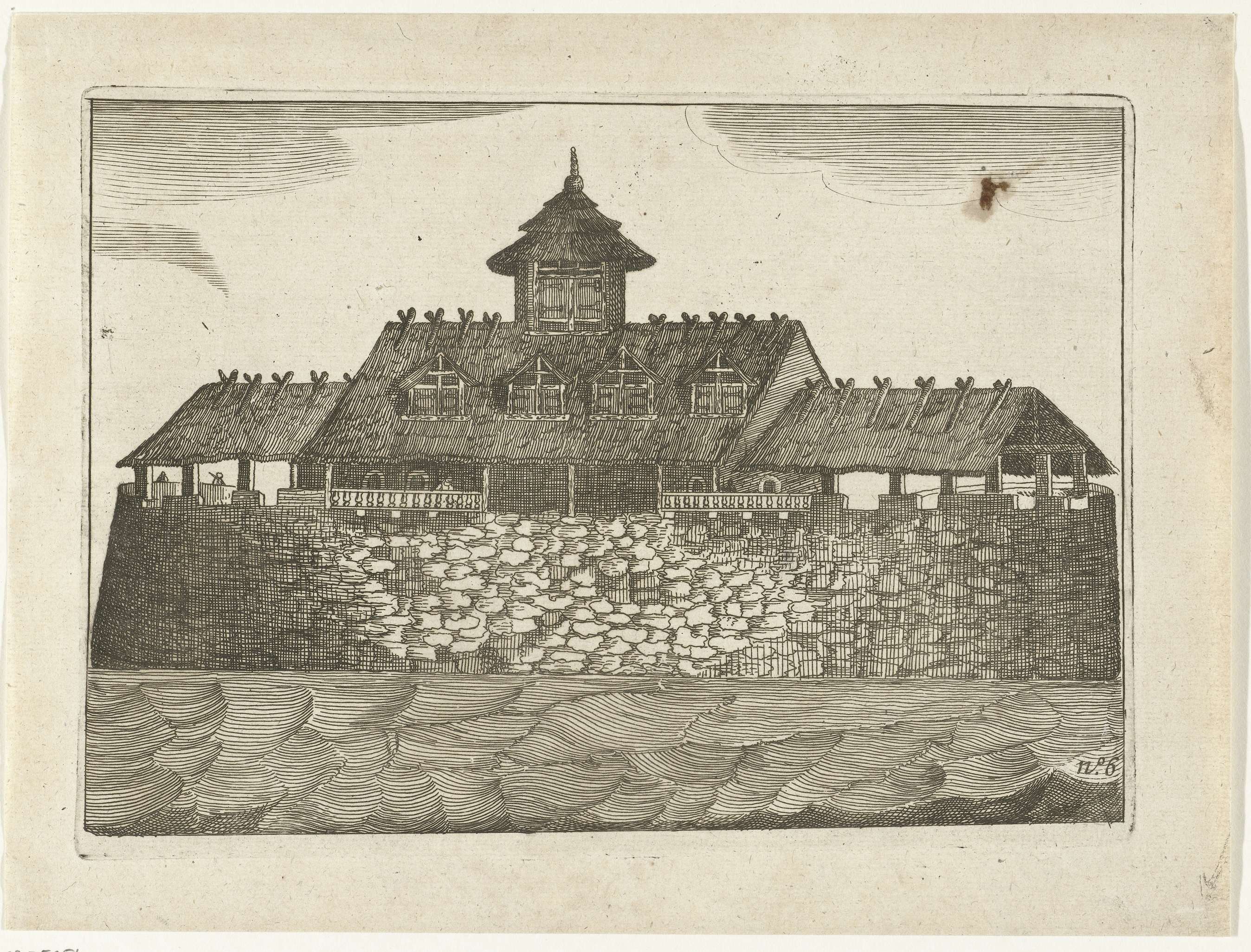 Het fort op Ambon (het kasteel op Amboina) gezien vanaf het water, 1607. Onderdeel van de illustraties in het verslag van de tocht door Cornelis Matelief de Jonge voor de VOC naar Oost-Indië en China, 1605-1608, No. 6.