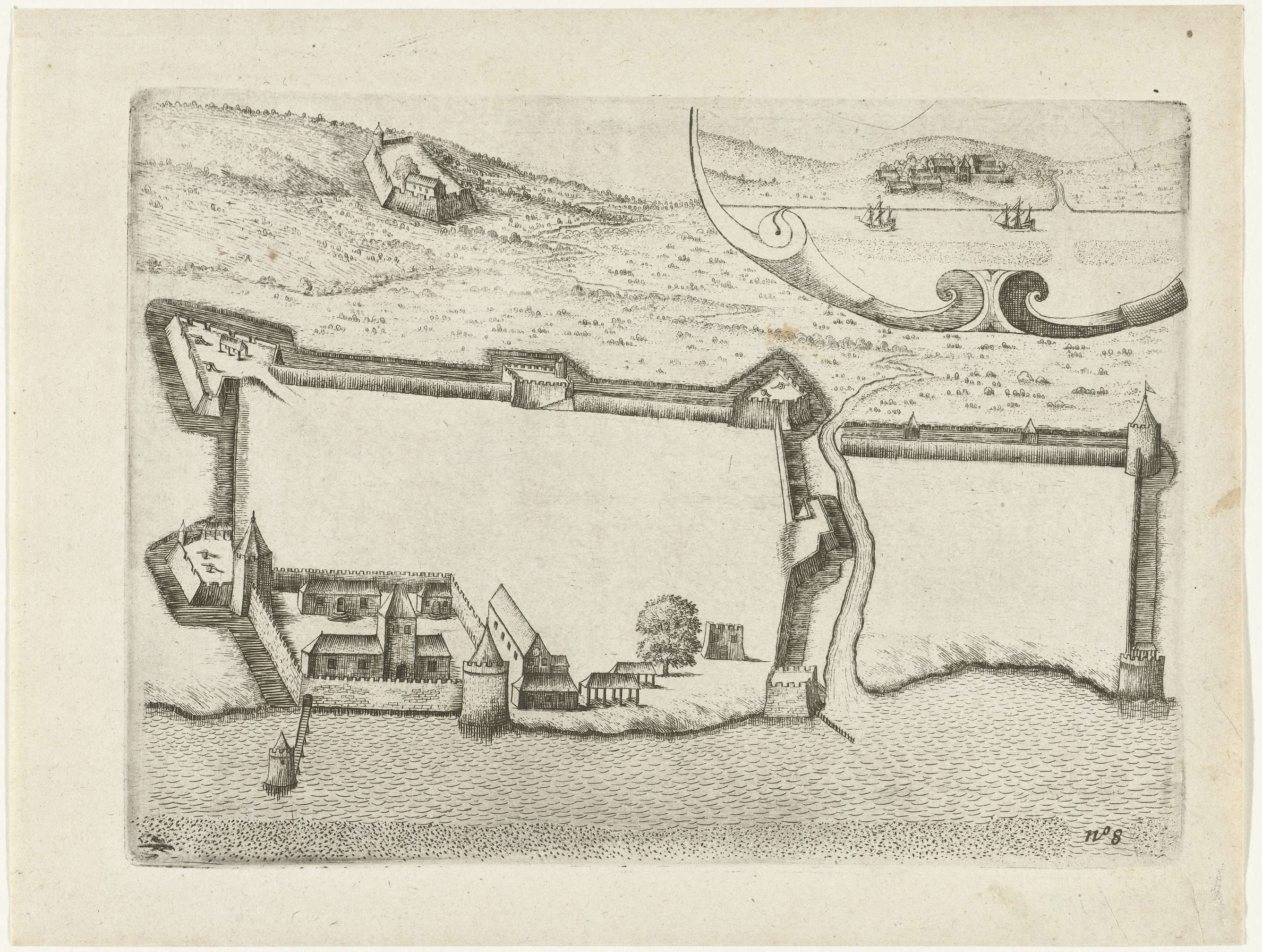 Plan van de stad Gammelamme op het eiland Ternate, 1607. Rechtsboven in een cartouche het aanzicht van zee. Onderdeel van de illustraties in het verslag van de tocht door Cornelis Matelief de Jonge voor de VOC naar Oost-Indië en China, 1605-1608, No. 8.
