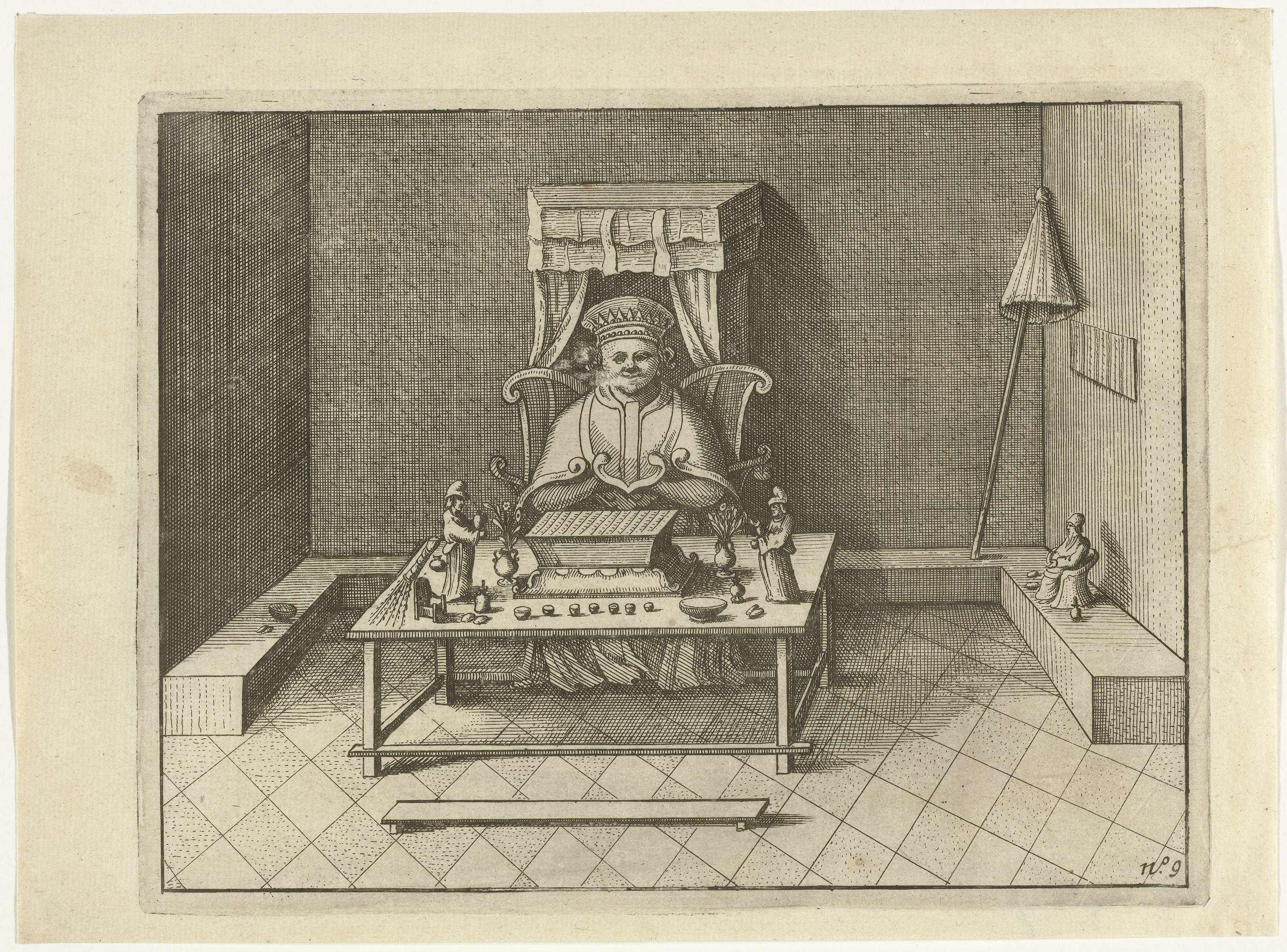 Chinees godenbeeld bij een altaar, op het eiland Lamao (Lamma?) onderweg naar Kanton, juli 1607. Rechtsboven in een cartouche het aanzicht van zee. Onderdeel van de illustraties in het verslag van de tocht door Cornelis Matelief de Jonge voor de VOC naar Oost-Indië en China, 1605-1608, No. 9.
