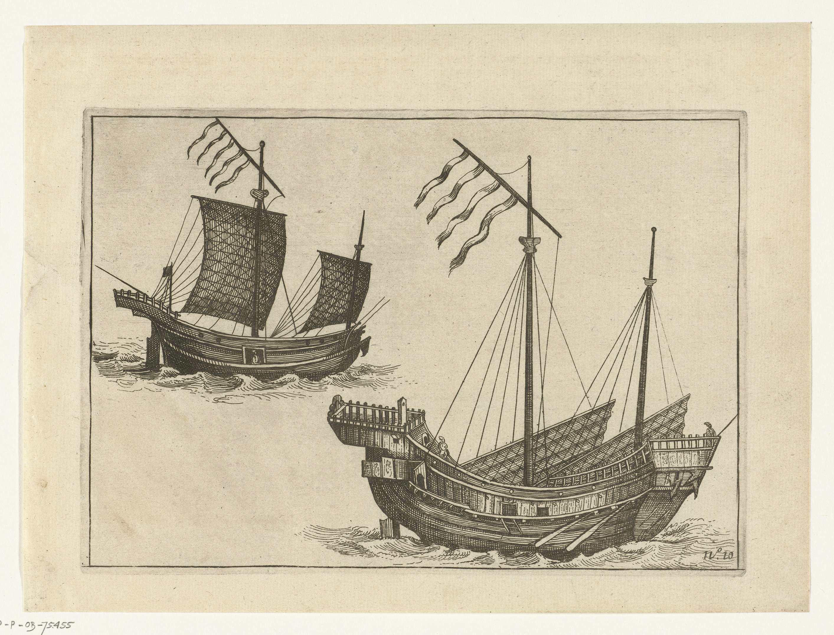 Twee Chinese jonken, in de omgeving van het eiland Lamao (Lamma?) onderweg naar Kanton, augustus 1607. Rechtsboven in een cartouche het aanzicht van zee. Onderdeel van de illustraties in het verslag van de tocht door Cornelis Matelief de Jonge voor de VOC naar Oost-Indië en China, 1605-1608, No. 10.