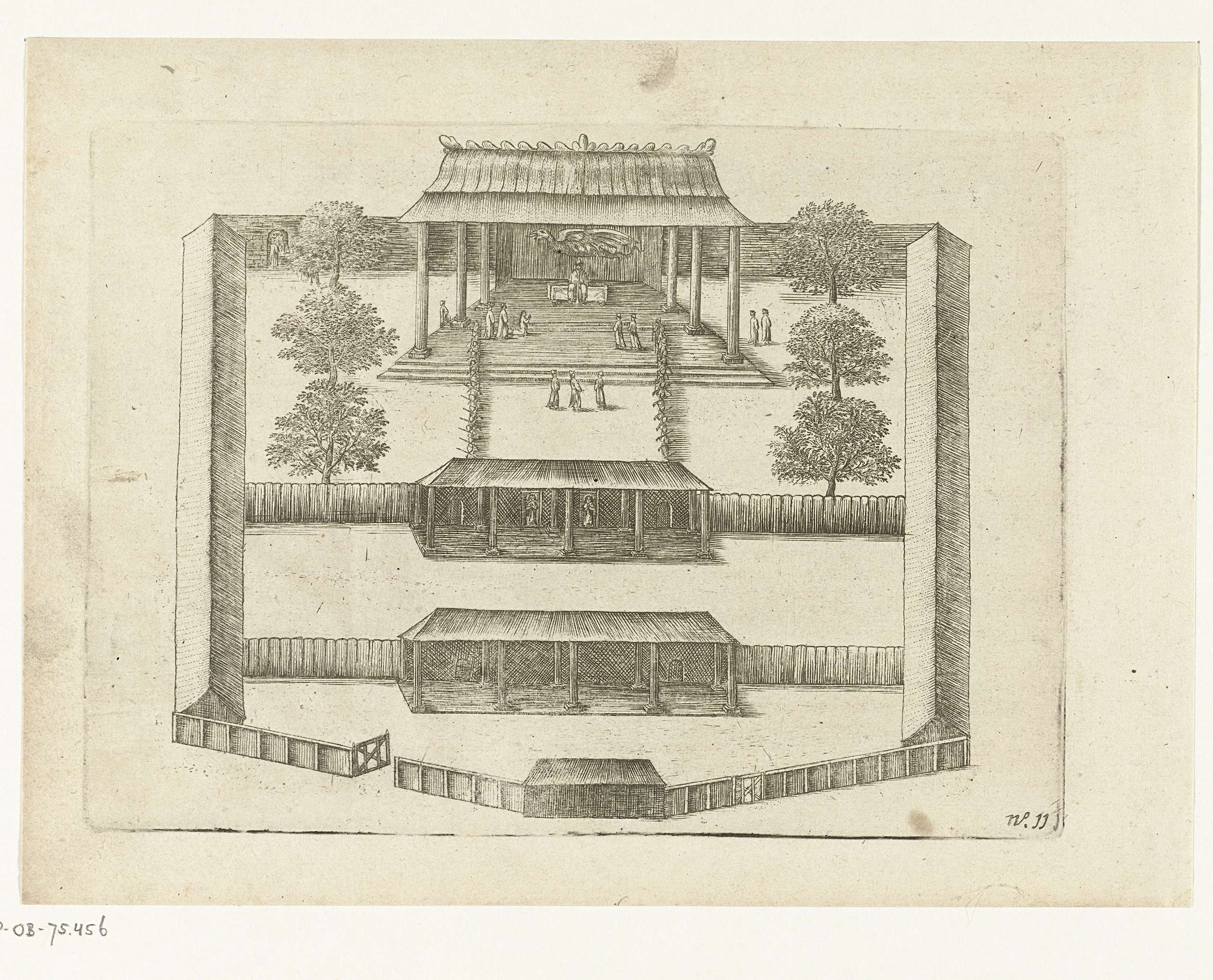 Het paleis van Lamthau op de rivier van Kanton, 1607. Plan van het ommuurde paleis met de koning zittend op zijn troon. Onderdeel van de illustraties in het verslag van de tocht door Cornelis Matelief de Jonge voor de VOC naar Oost-Indië en China, 1605-1608, No. 11.
