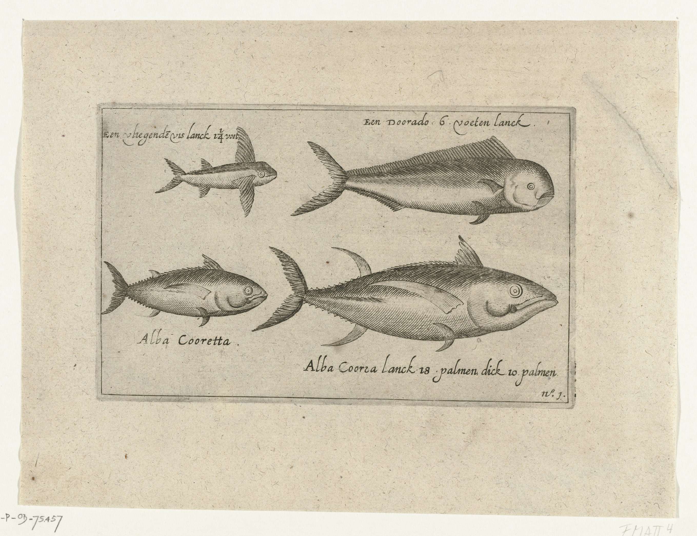Verschillende soorten vis waaronder dorade en vliegende vis, gevangen in de omgeving van de Kaapverdische eilanden, januari 1607. Onderdeel van de illustraties in het verslag van de tochten van Pieter van den Broecke naar Oost-Indië, 1605-1640, No. 1.