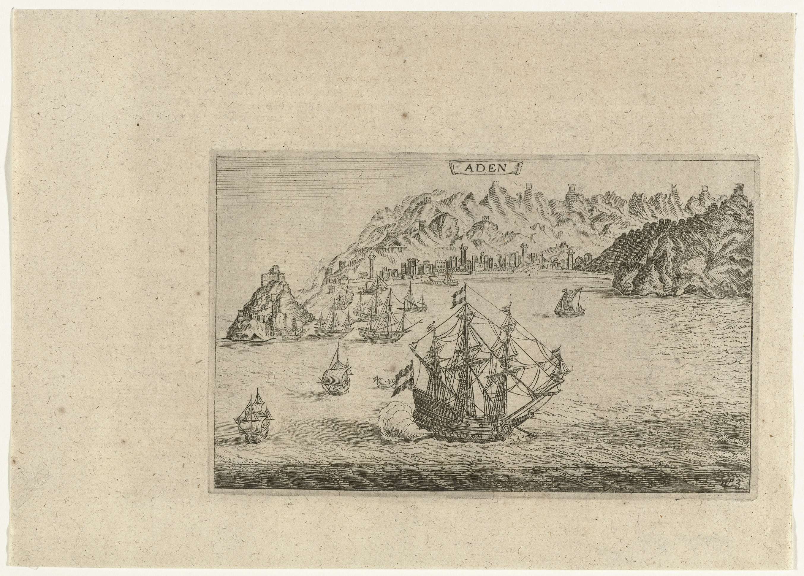 Het schip van Van den Broeck liggend voor anker in de haven van Aden, augustus 1613. Onderdeel van de illustraties in het verslag van de tochten van Pieter van den Broecke naar Oost-Indië, 1605-1640, No. 3.