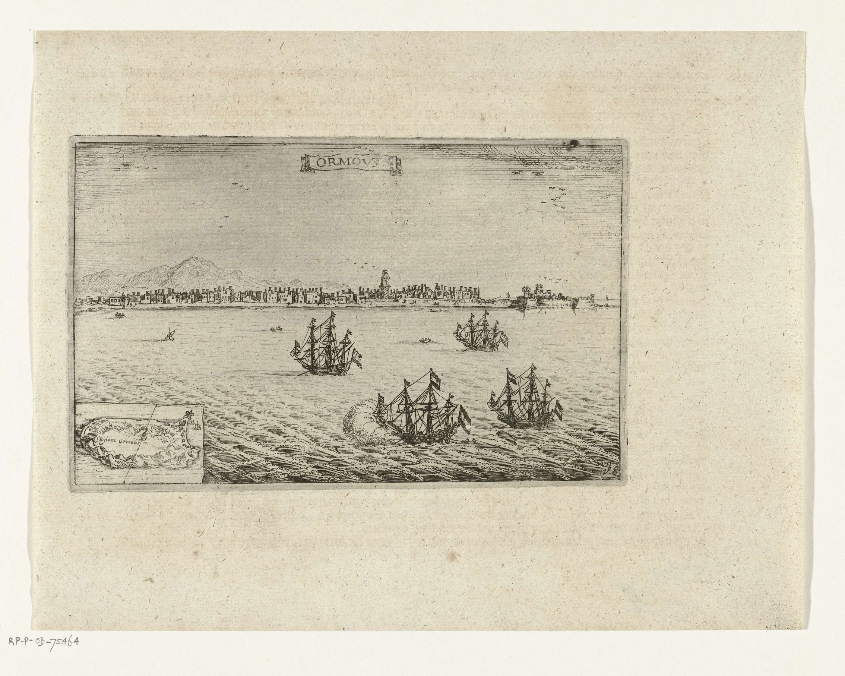 Schepen bij het eiland Hormoz en de stad Gamron (Bandar-e Abbas) op het vasteland van Perzië, februari 1629. Linksonder een inzet met een klein kaartje van het eiland Hormoz. Onderdeel van de illustraties in het verslag van de tochten van Pieter van den Broecke naar Oost-Indië, 1605-1640, No. 8.