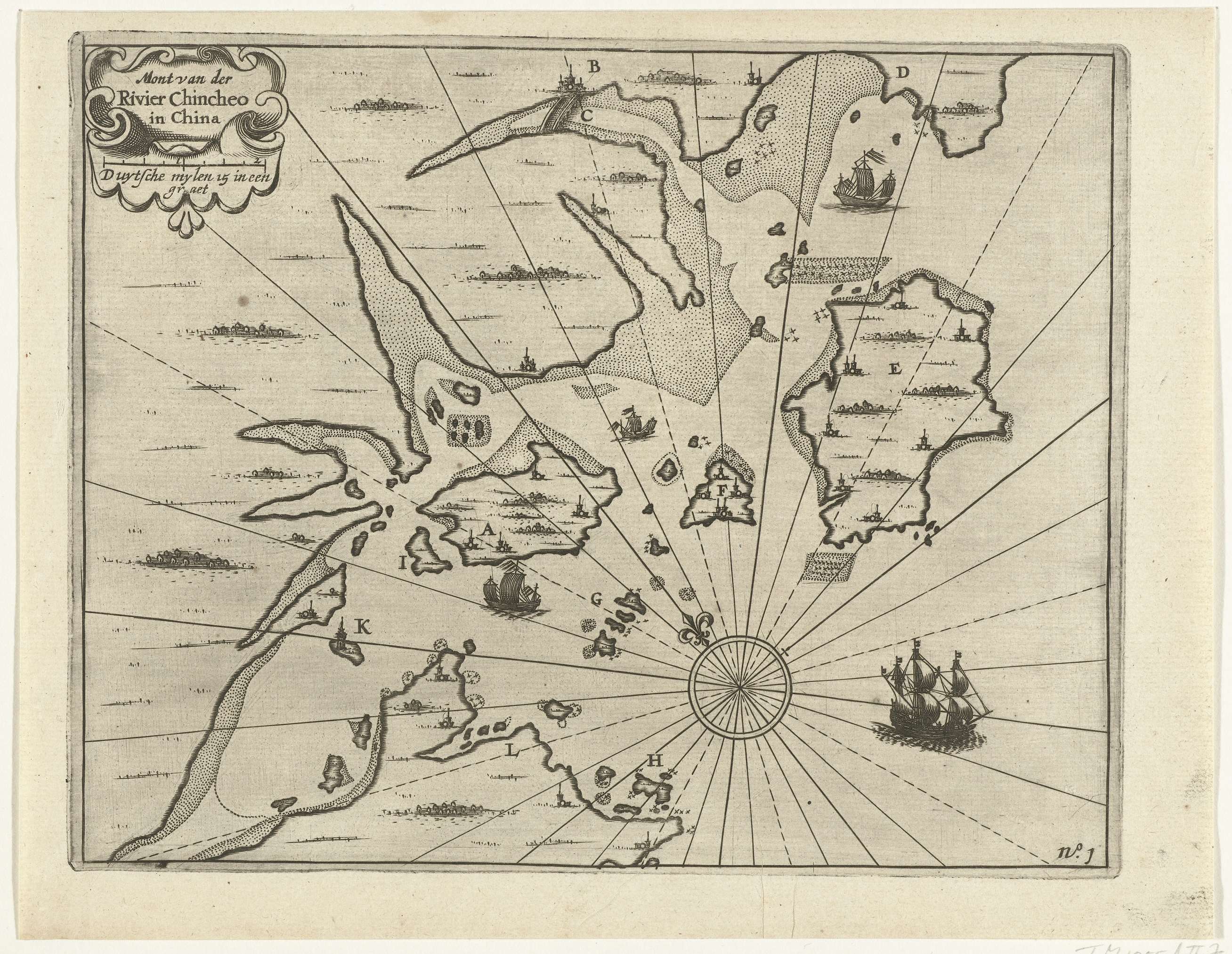 Kaart van de kust van China bij Xiamen, mei 1632. Rechts het eiland Quemoy. Onderdeel van de illustraties in het verslag van de reis naar Oost-Indië van Seyger van Rechteren, 1628-1632, No. 1.