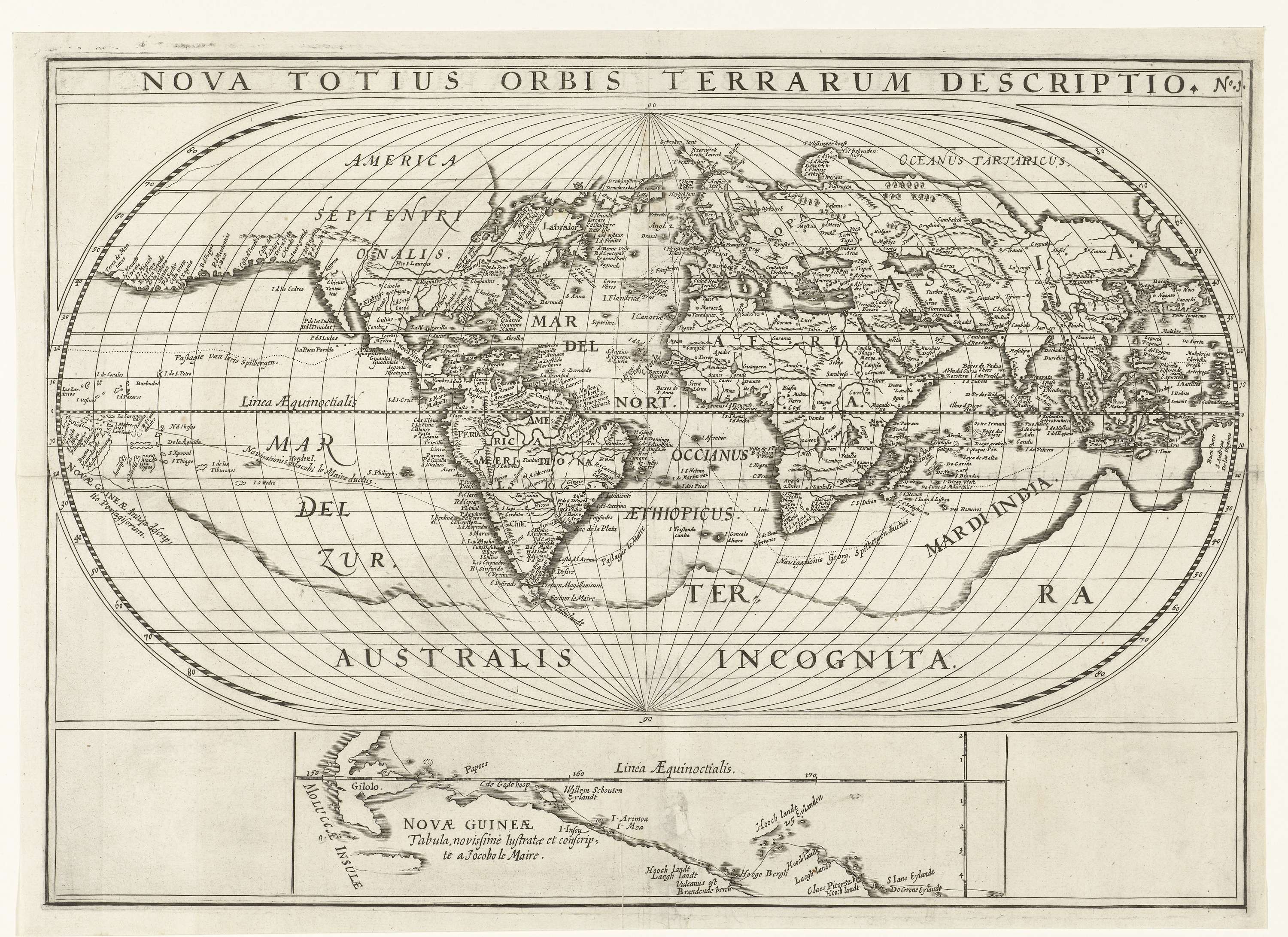 Kaart van de wereld waarop staan aangegeven de reizen van Joris van Spilbergen en Jacob le Maire om de wereld, 1614-1617. Onderaan een detail van de noordkust van Nieuw-Guinea. Onderdeel van de illustraties in het verslag van de reis van Joris van Spilbergen om de wereld, 1614-1617, No. 1.