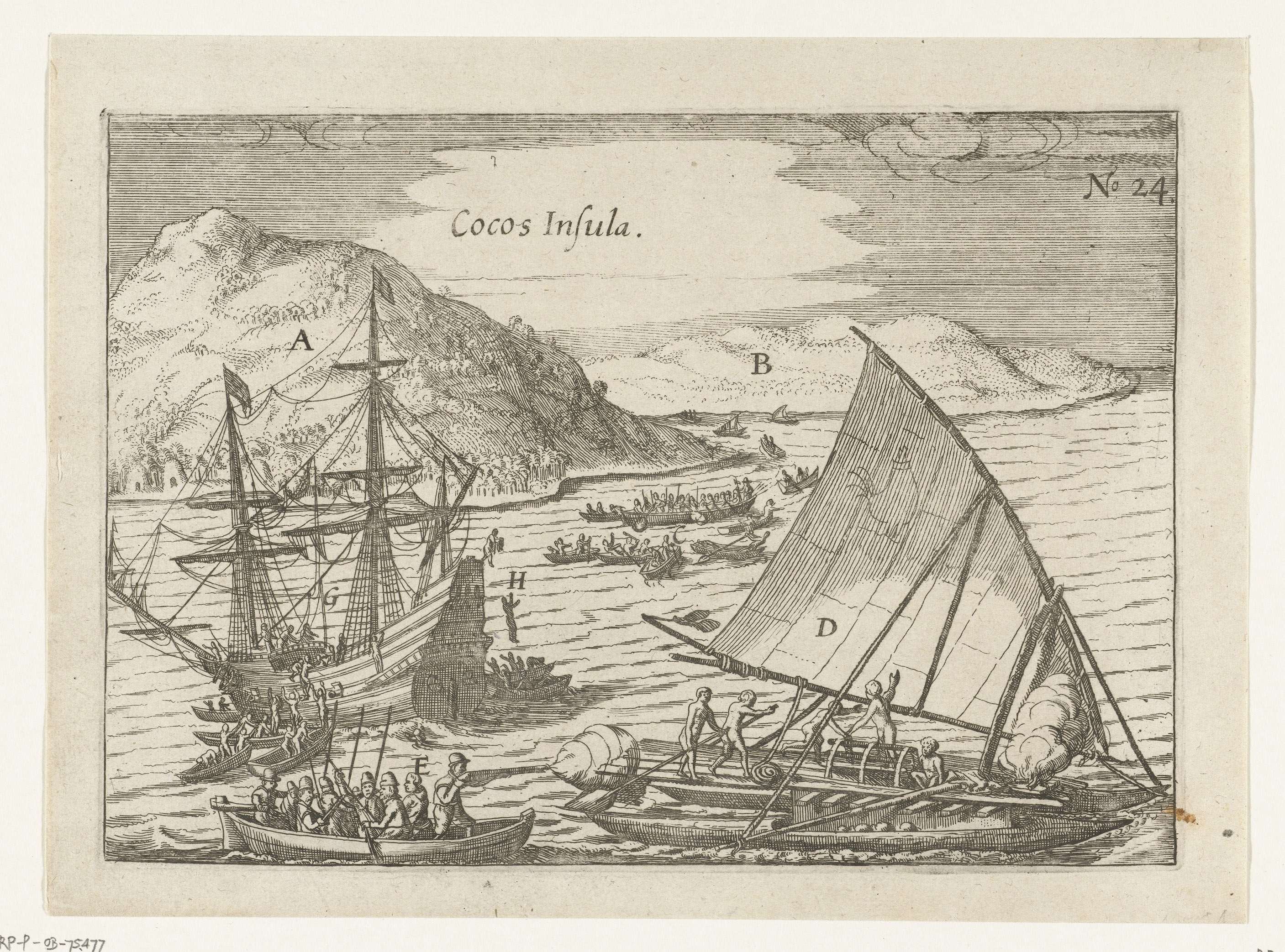 Het schip de Eendracht bij Cocos eiland, mei 1616. Schermutselingen met de lokale bevolking die op het schip klimmen. Onderdeel van de illustraties van de Australische Navigatien van Jacob le Maire opgenomen in het verslag van de reis van Joris van Spilbergen om de wereld, 1614-1617, No. 24.
