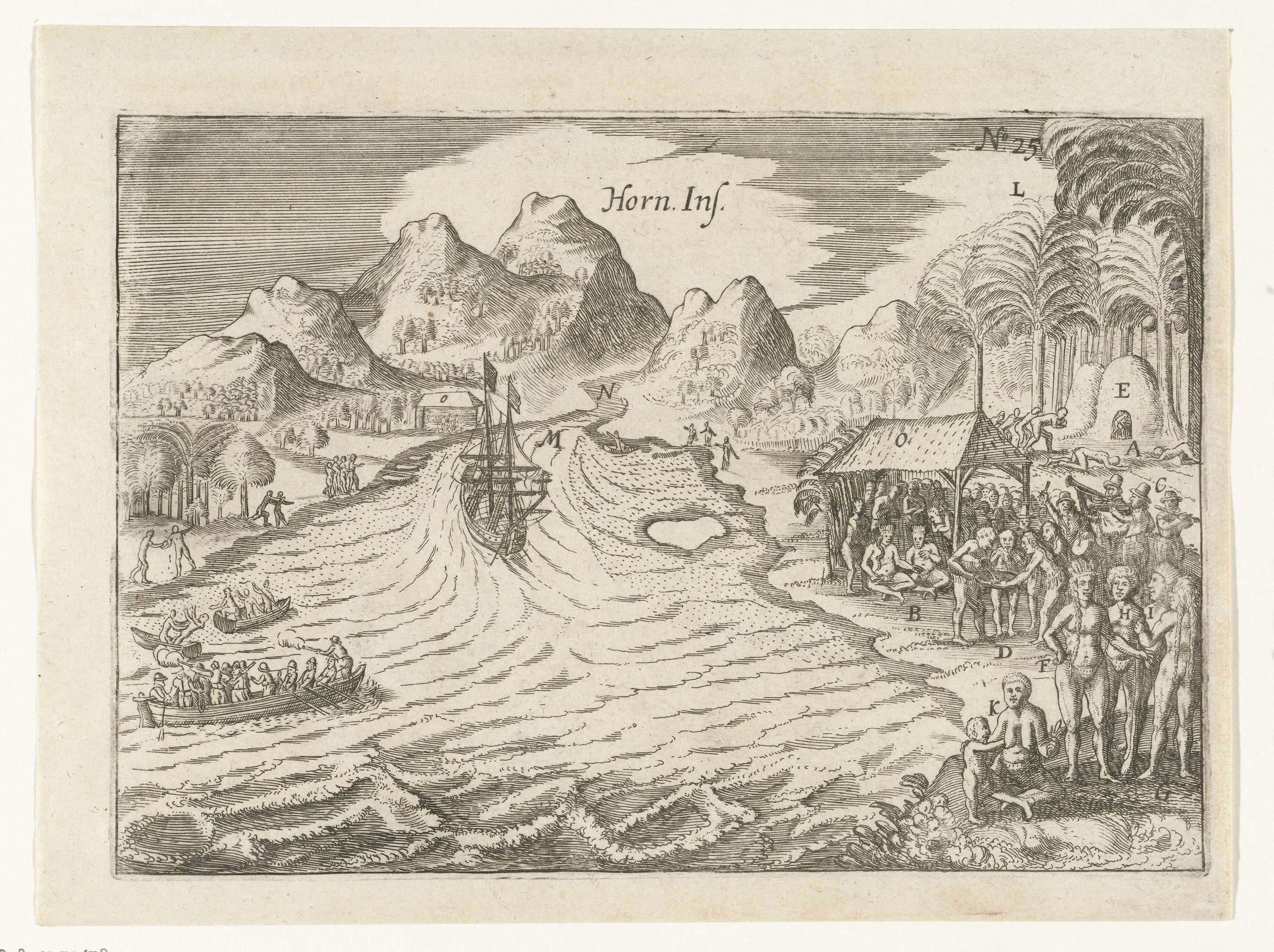 Het schip de Eendracht bij de Hoornse eilanden, mei 1616. Rechts de ontvangst en ontmoeting met de lokale vorsten. Onderdeel van de illustraties van de Australische Navigatien van Jacob le Maire opgenomen in het verslag van de reis van Joris van Spilbergen om de wereld, 1614-1617, No. 25.