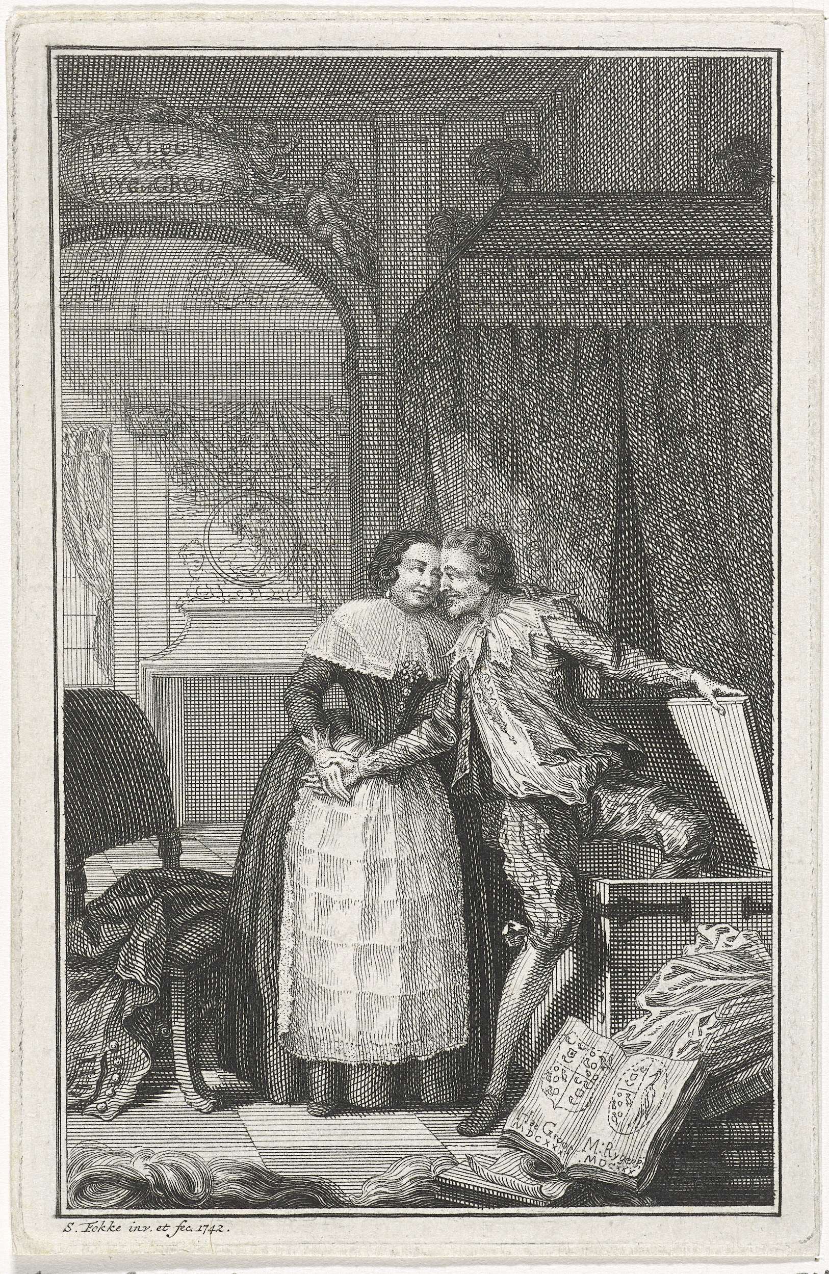 Hugo de Groot stapt in een boekenkist en neemt afscheid van zijn echtgenote Maria van Reigersberch, die het plan voor de ontsnapping met de boekenkist had bedacht. Boven de doorgang naar een volgend vertrek staat de tekst: De Vlugt van Huyg de Groot. Deze prent is vervaardigd voor het gelijknamige blijspel van Frederik Duim (1742).