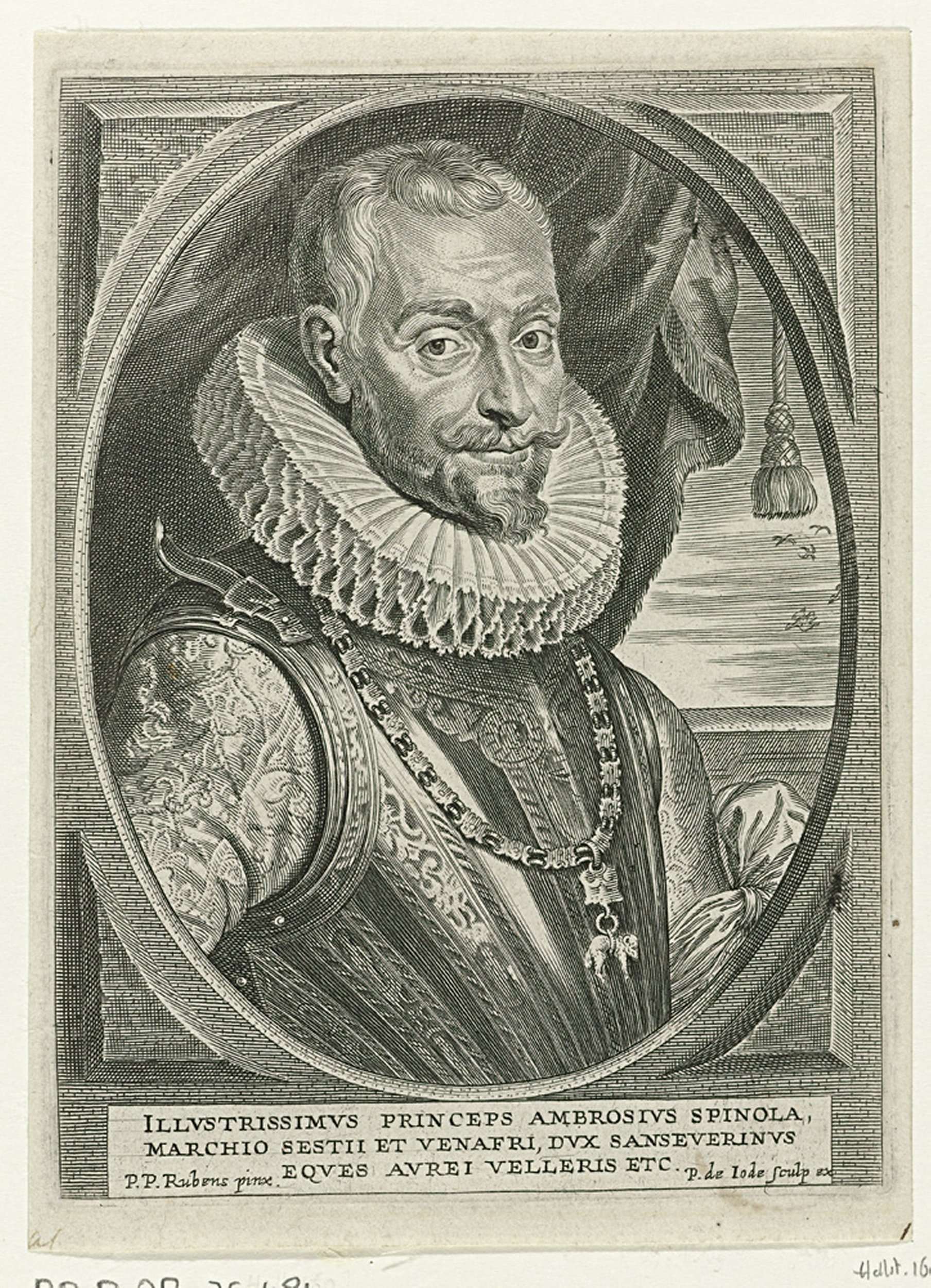 Busteportret van Ambrogio Spinola, in harnas. Hij draagt een keten met de Orde van het Gulden Vlies en een strik om zijn linkerarm. Het portret is gevat in een ovale omlijsting met vierkant randwerk. In het kader een drieregelig onderschrift in het Latijn.