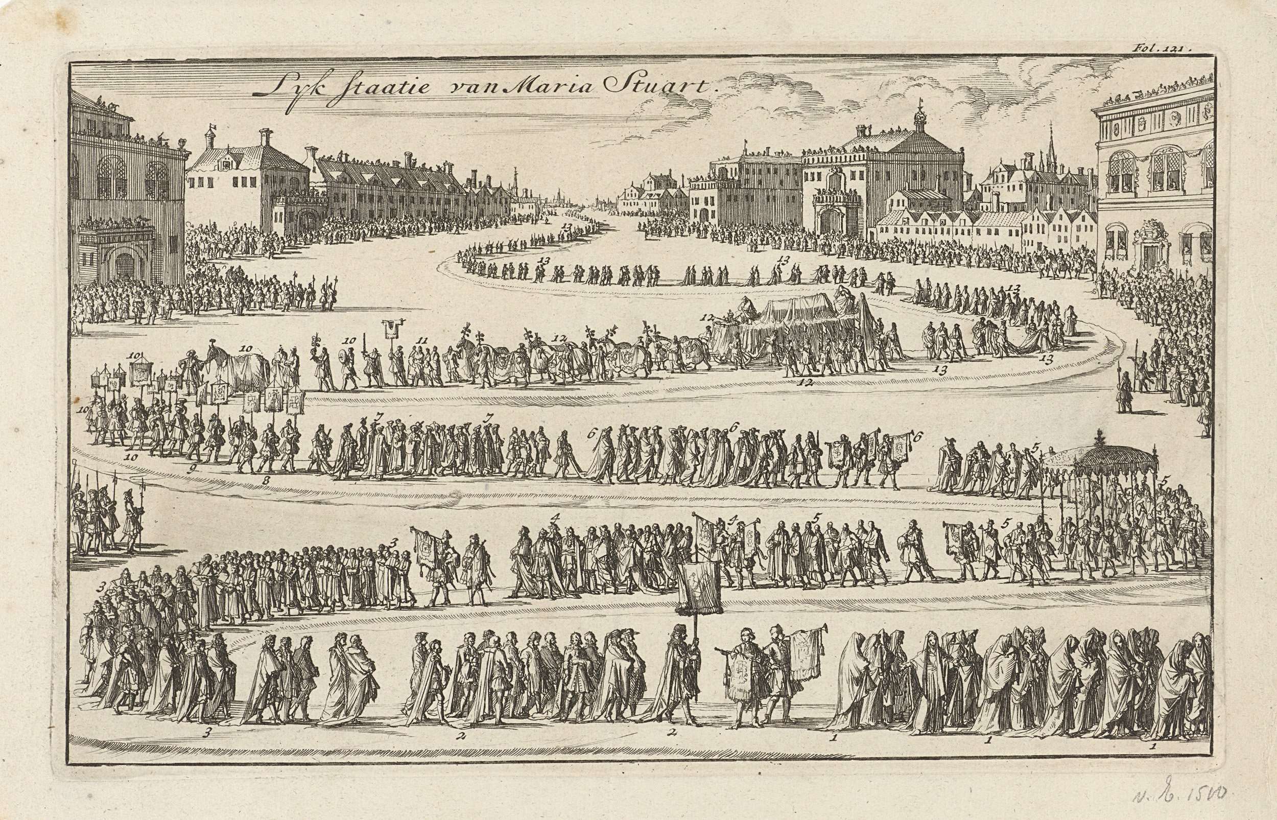Kleine voorstelling van de lijkstatie van de overleden koningin Maria Stuart, gehouden in Londen op 5 maart 1695. Onderdelen van de stoet zijn genummerd, maar de legenda ontbreekt. Rechtsboven gemerkt: Fol. 121.