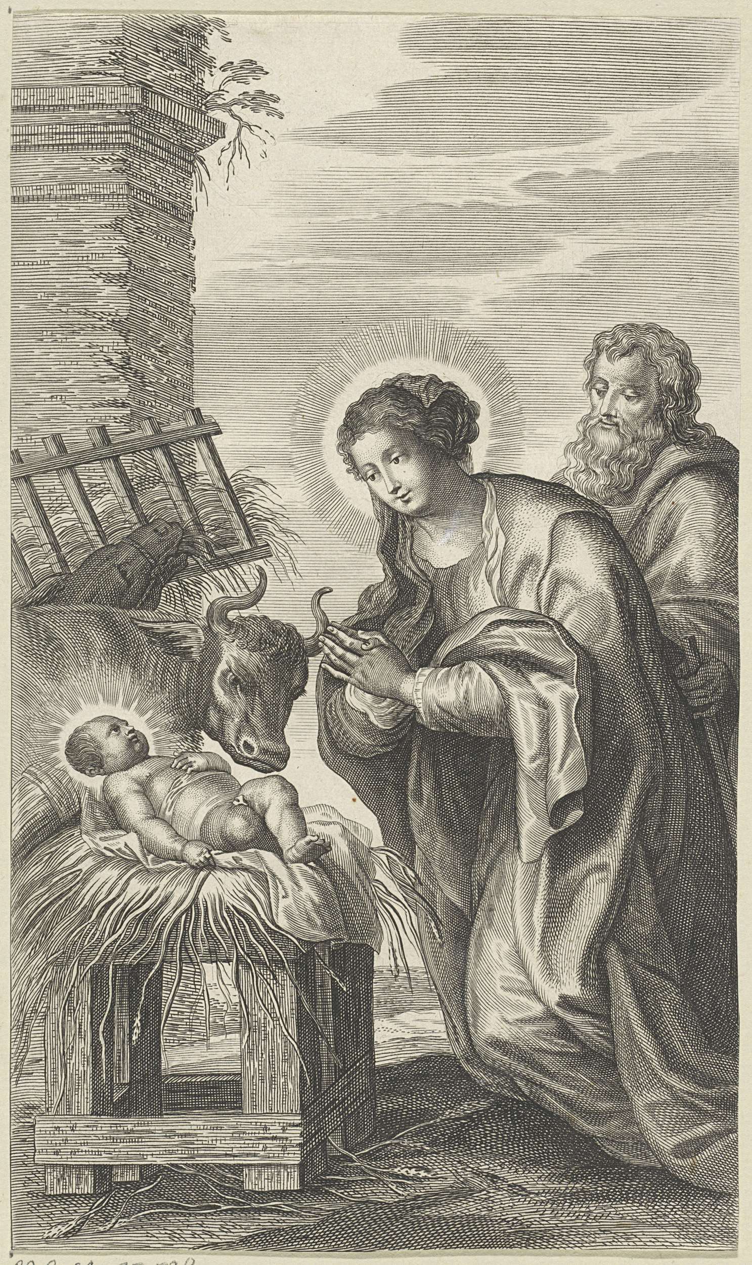 Maria knielt bij de kribbe van Christus. Achter haar staat Jozef. Op de achtergrond de os en de ezel.