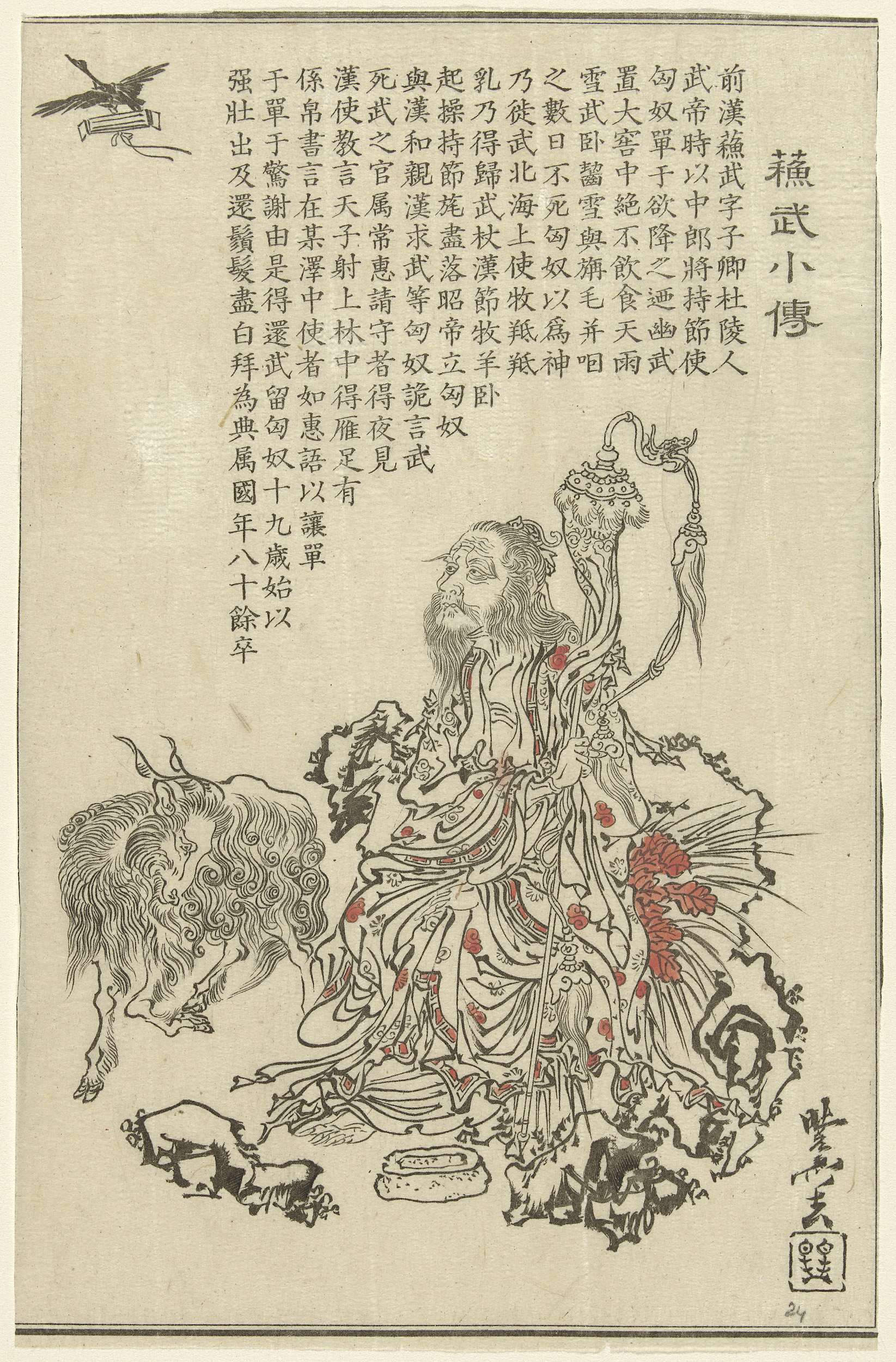 De Chinese hoveling Suwu, ontvoerd naar het hoge noorden, als herder zittend op een rots met een ram naast zich; linksboven een wegvliegende vogel met een door Suwu geschreven briefje aan de poot waarin hij de keizer laat weten nog steeds in leven te zijn. Blad uit een Japans boek.