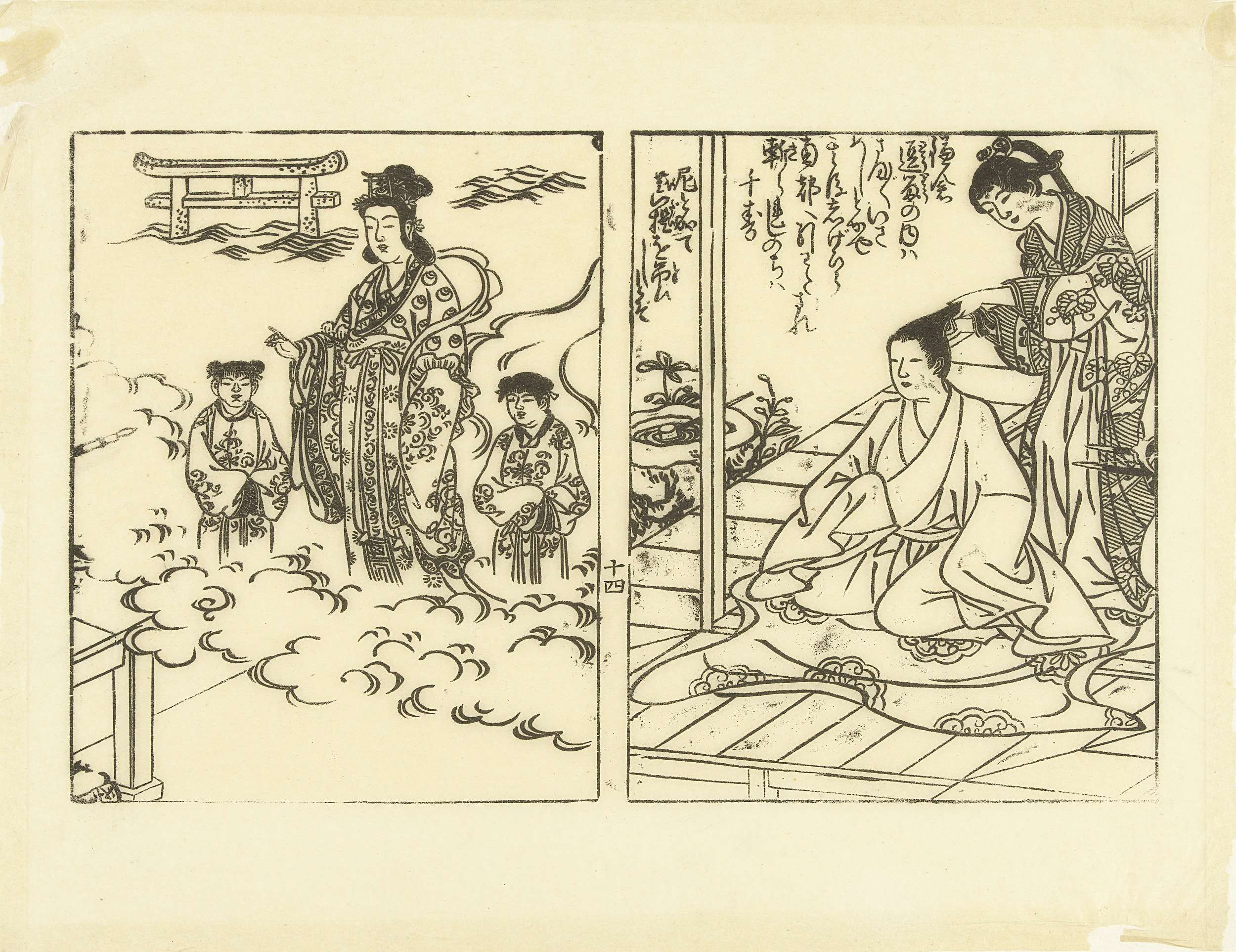 Blad met twee voorstellingen. Links, een godin met twee kinderen staand tussen wolken; op de achtergrond de bovenkant van een torii (toegangspoort tot een shintoïstisch heiligdom). Rechts, een dienster de haren kammend van een op een veranda zittende vrouw. Pagina 14 uit een Japans boek.