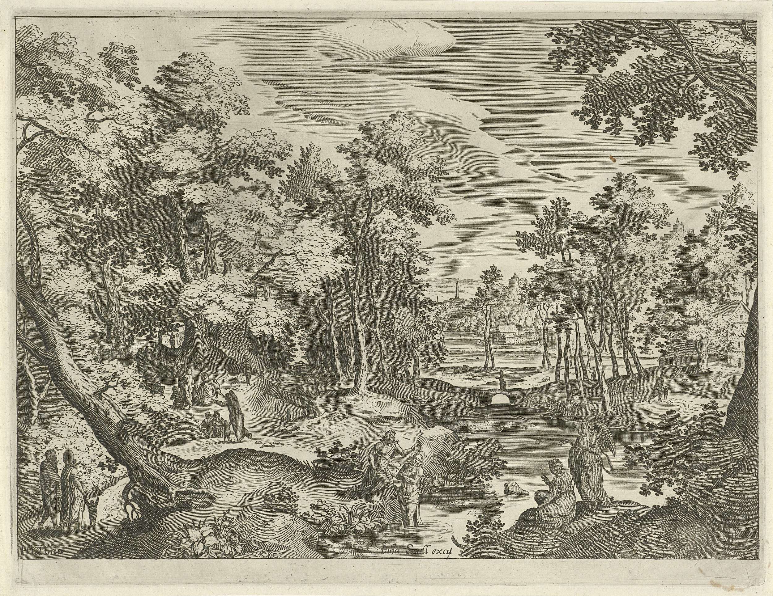 Bebost landschap met een rivier. In het midden wordt Christus door Johannes de Doper in de rivier gedoopt. Engelen houden Christus zijn kleren vast op de oever. Op de achtergrond predikt Johannes de Doper op een open plek in een bos. De prent is deel van een achtdelige serie van landschappen met scènes uit het ...