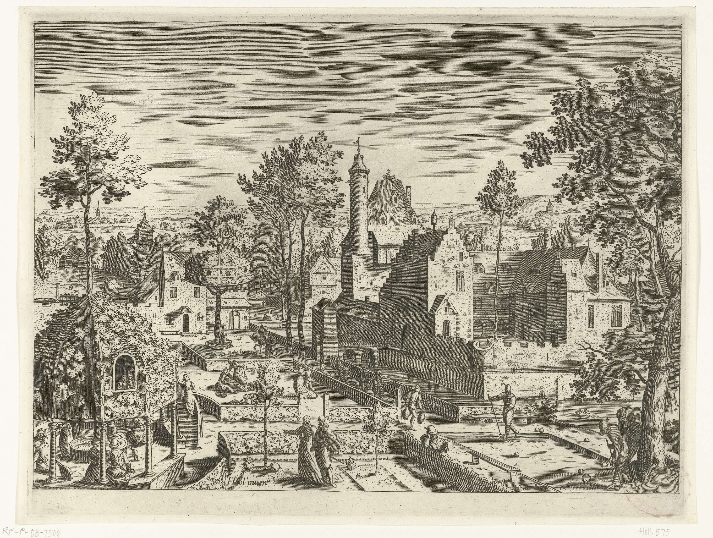 Gezicht op de tuin van een kasteel of een buitenverblijf. Verschillende wandelaars en paartjes verkennen de tuin. Rechts op de voorgrond een paviljoen. Op de achtergrond rechts het kasteel. De prent maakt deel uit van een vierdelige serie met landschappen.