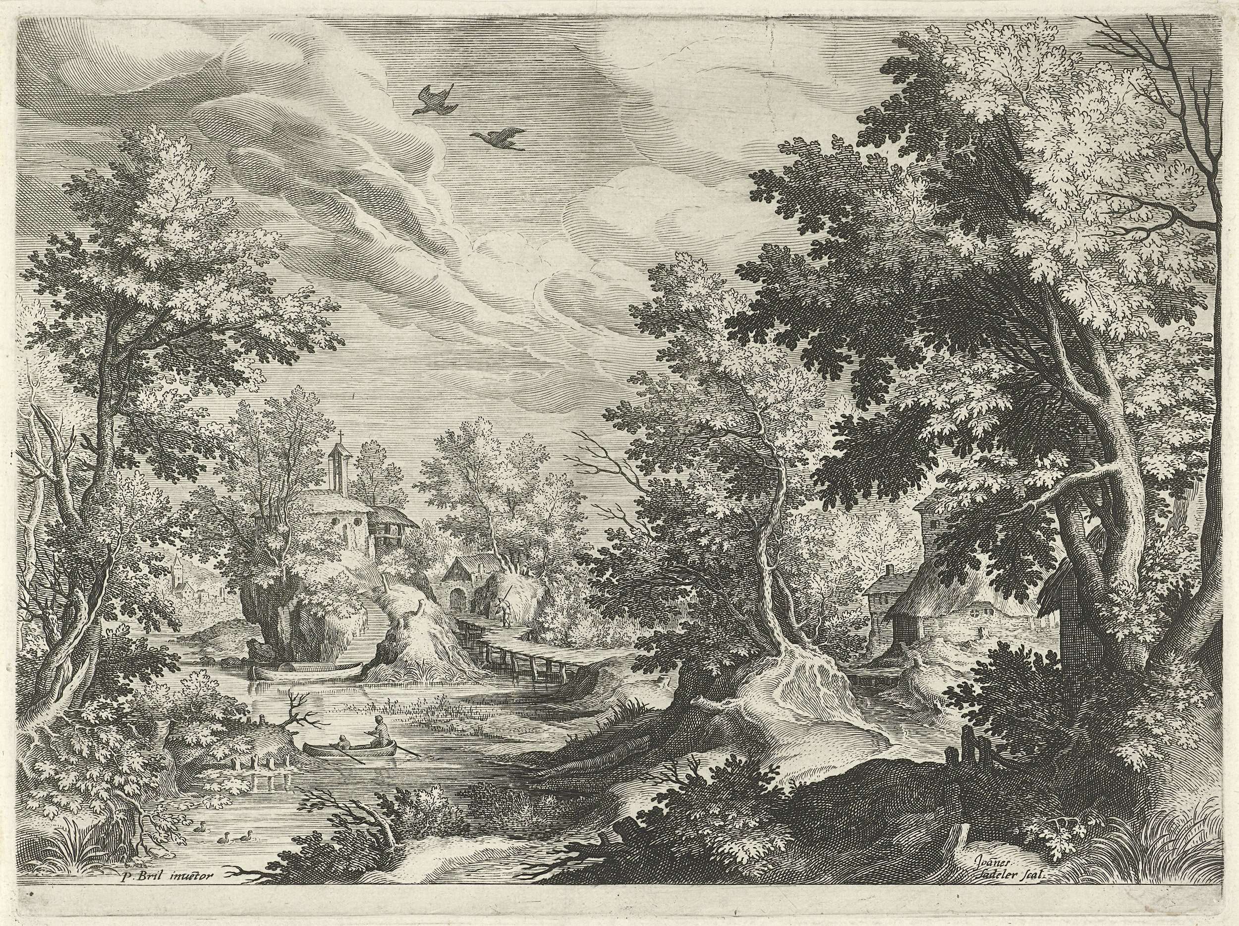 Landschap met links een rivier, rechts een bos. Op de achtergrond een eiland midden in de rivier met een huis. Op de rivier een roeiboot met twee mensen.