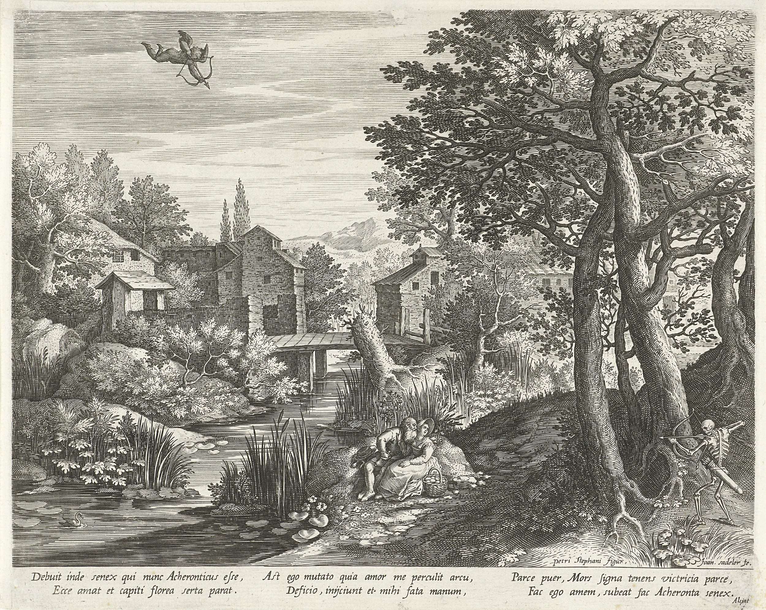 Heuvelachtig landschap met een brug over een rivier. Aan de oever een ongelijk paar (een oude man en een jonge vrouw), zittend op de grond. Cupido vliegt in de lucht met pijl en boog in aanslag, de Dood staat rechts tussen de bomen met pijl en boog. Dit is de verbeelding van een embleem, waarbij ...