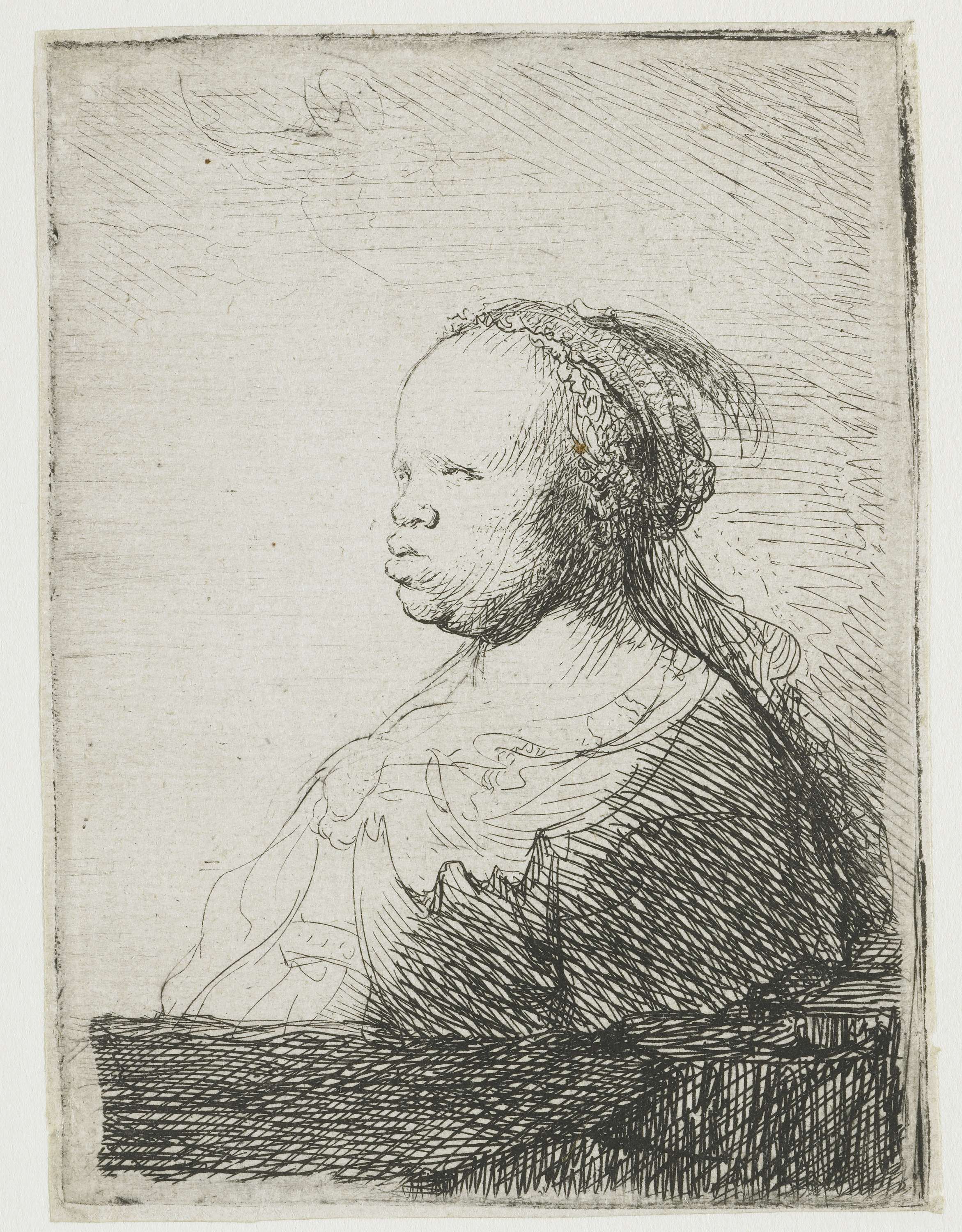 Waar Rembrandt deze Afrikaanse vrouw zag weten we niet, maar zijn naaste collega’s portretteerden haar ook in deze jaren. De vlotte, schetsmatige manier waarop hij haar gezicht tekende wekt de indruk dat hij snel werkte. Wat ze draagt duidde hij maar vaag aan, al vertelt de veer op haar muts hoe dan ook dat ze ...