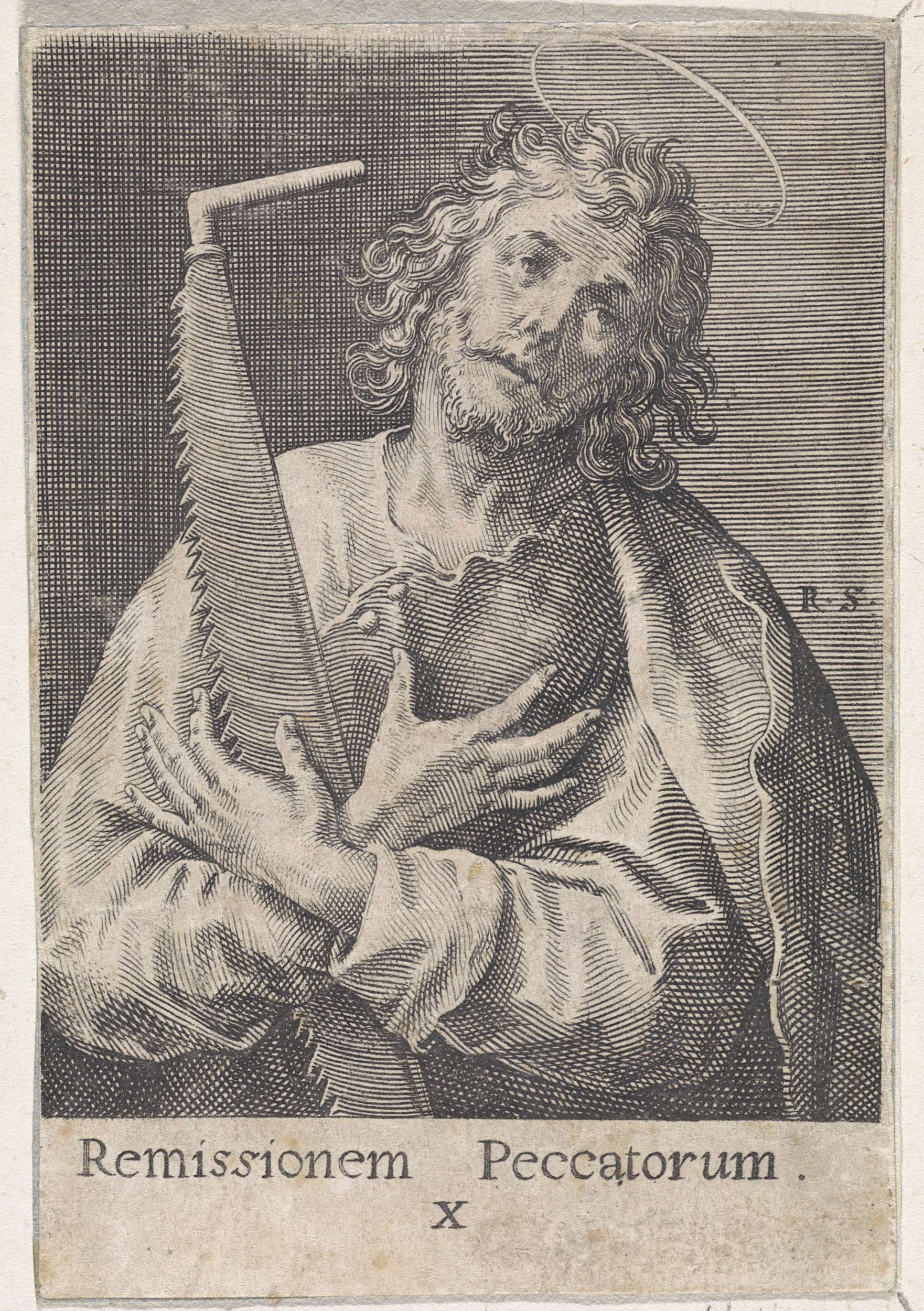 De apostel Simon de Zeloot, met als attribuut de zaag. De prent heeft een Latijns onderschrijft met een regel uit het Credo. De twaalfde prent in een serie van veertien waarvan de prenten met een apostel genummerd zijn van 1 tot 12.