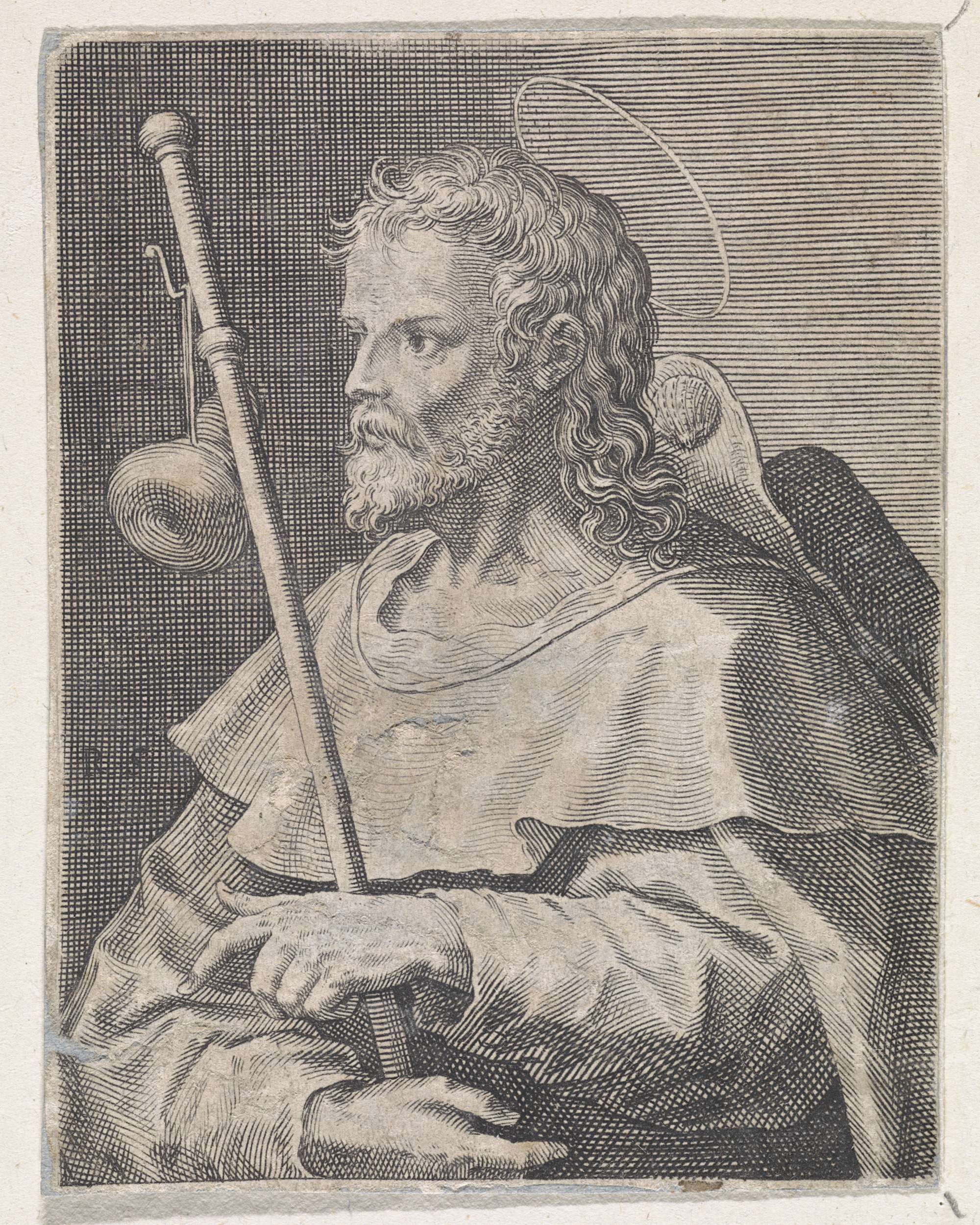 De apostel Jakobus de Meerdere, met als attribuut de pelgrimsstaf. De prent heeft een Latijns onderschrijft met een regel uit het Credo. De vijfde prent in een serie van veertien waarvan de prenten met een apostel genummerd zijn van 1 tot 12.