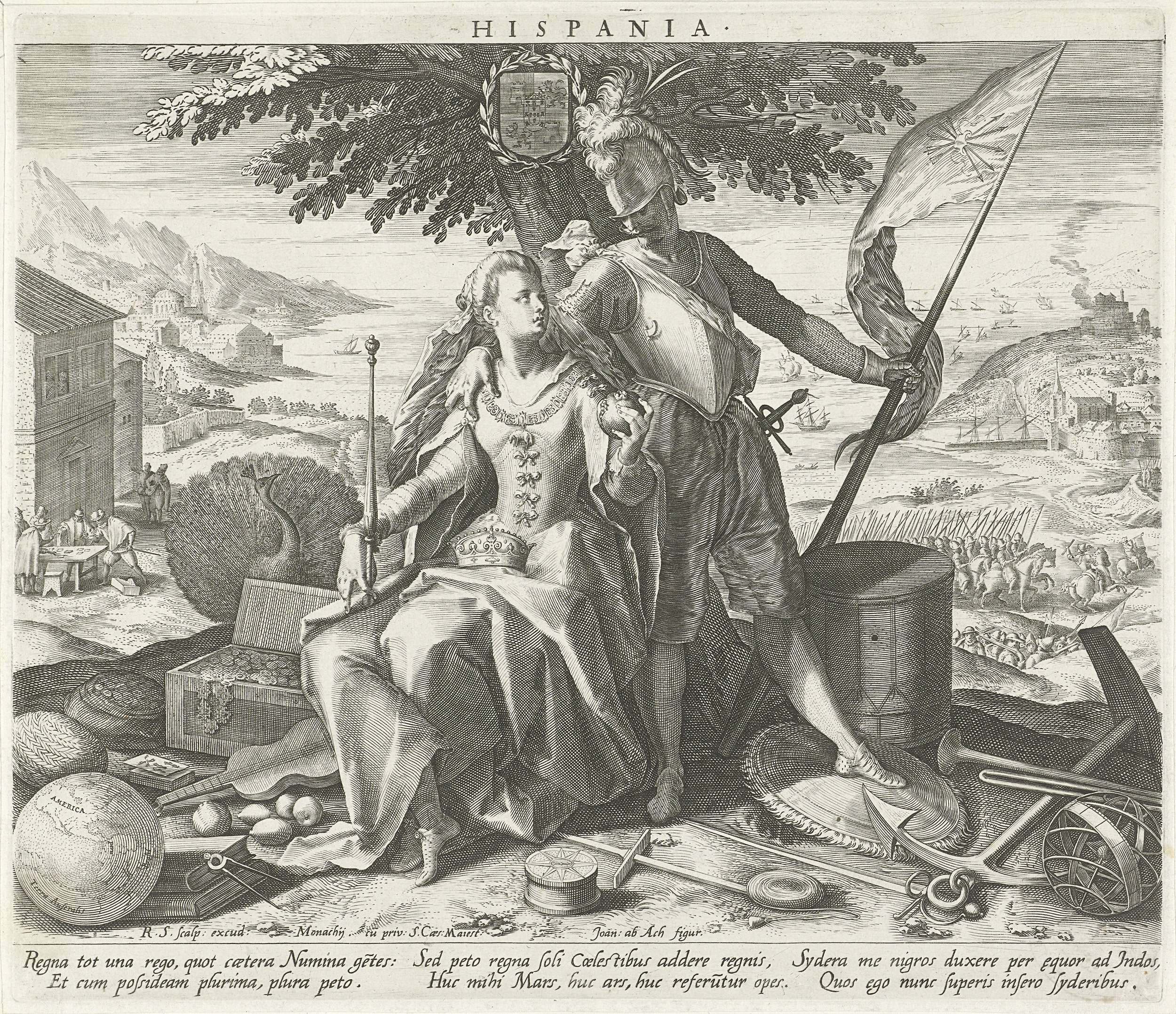 Een allegorie op Spanje. In het midden onder een boom de goden Juno (vruchtbaarheid) en Mars (oorlog). Juno houdt een scepter en een granaatappel in de handen. Op haar schoot de Spaanse kroon. Mars heeft een vlag in zijn hand. Rondom hen op de grond liggen wapentuig, een wereldbol met erop Amerika, een schatkist met ...