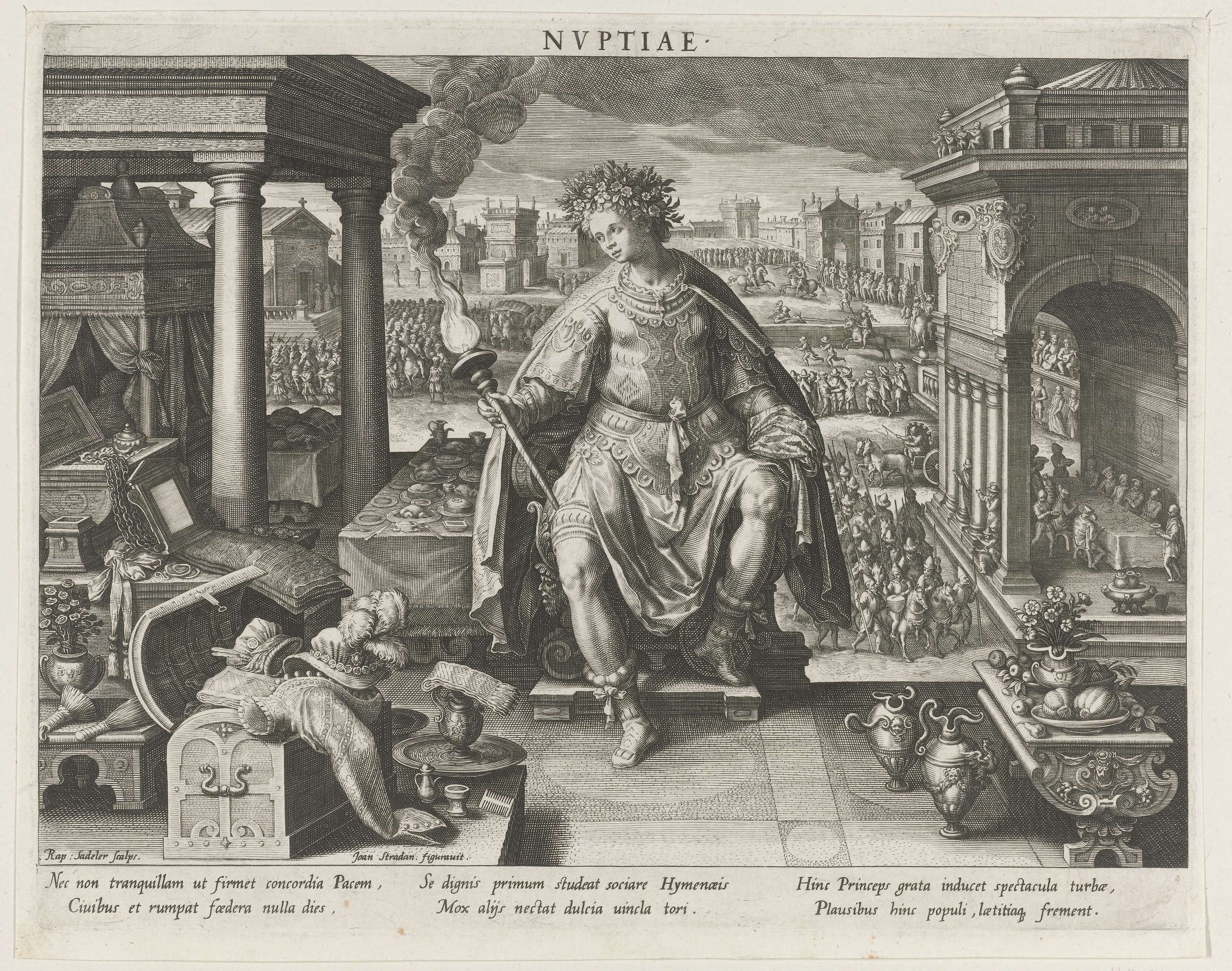 Op de voorgrond de personificatie van het huwelijk met een fakkel in de hand. Hij wordt omringd door allerlei huwelijksgeschenken en attributen van het huwelijk (zoals het huwelijksbed en de huwelijkstafel). Op de achtergrond links de huwelijkskerkgang. Op de achtergrond rechts een toernooi ter ere van een bruiloft. Rechts de bruiloftsmaaltijd. De prent heeft een ...