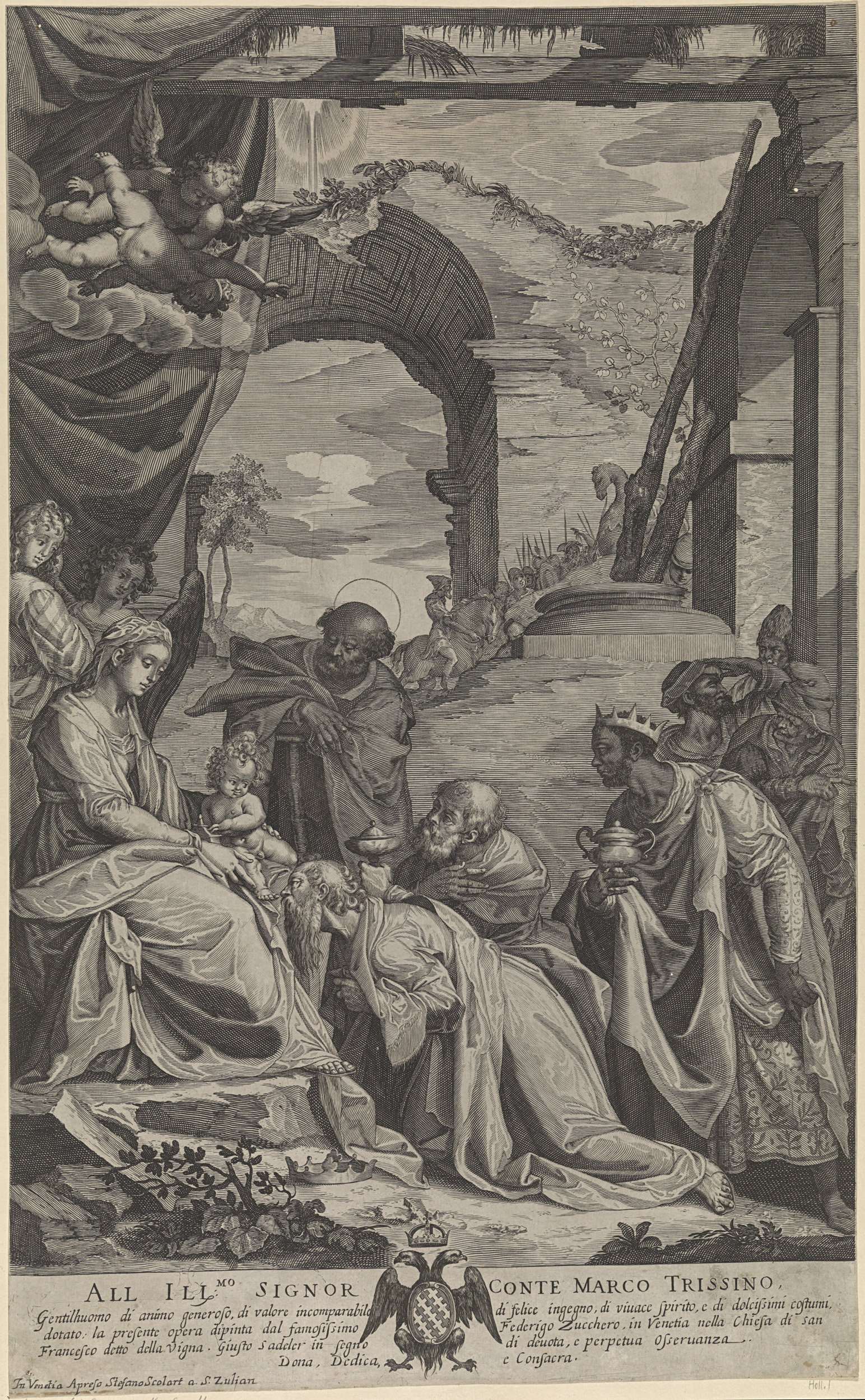 Maria en Jozef tonen het Christuskind aan de drie wijzen. De koningen knielen voor het kind en bieden het geschenken aan. De voorste koning kust zijn voeten. Aan de hemel straalt de ster die hen heeft geleid. De prent eheft een Italiaans onderschrift met een opdracht en het wapenschild van Marcus Trissinus.
