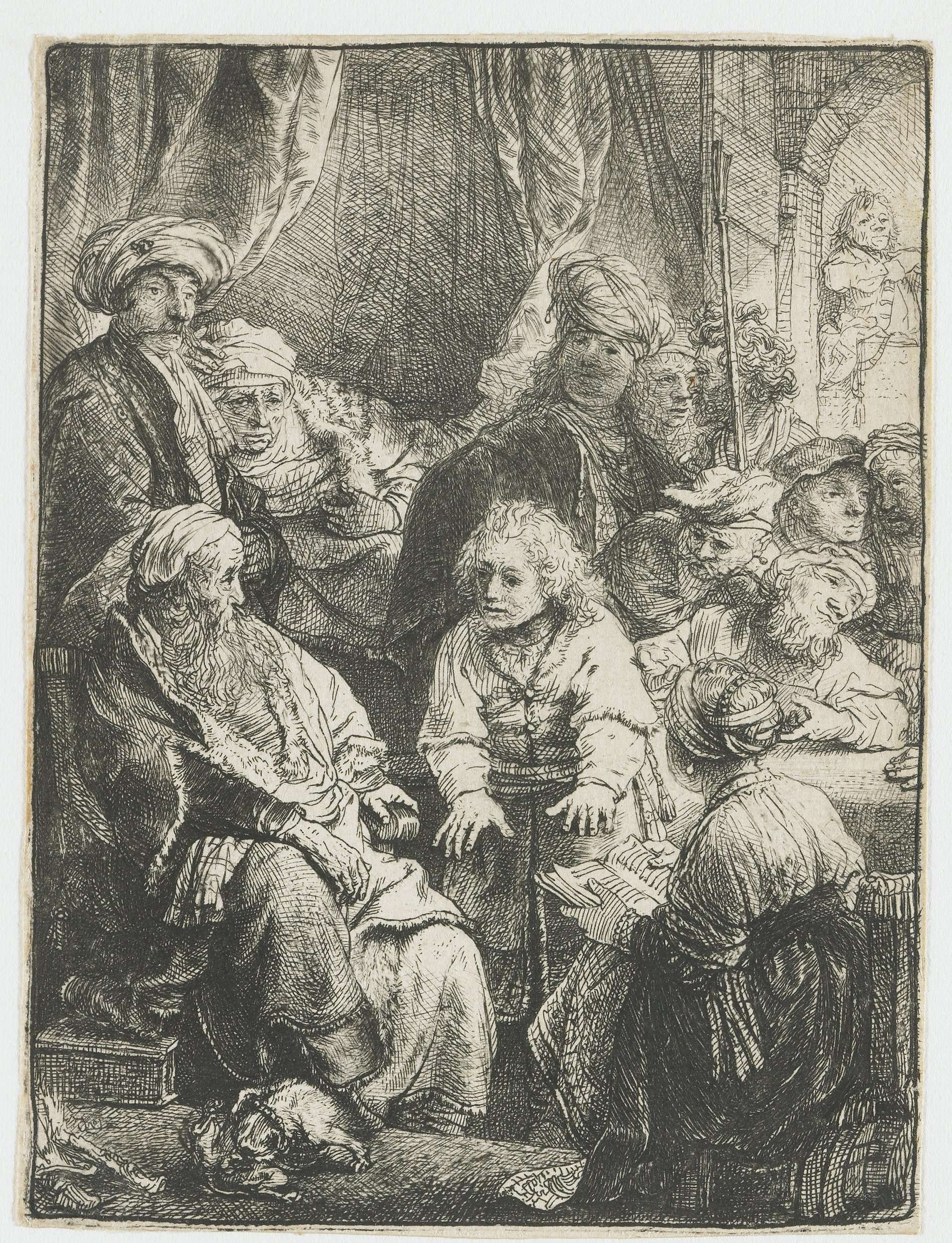 Hier vertaalt Rembrandt Jozefs verhaal, dat hij in zijn eerdere olieverfschets (links) had voorbereid, naar een veel kleiner etsje. Opnieuw zijn alle tien de broers aanwezig, al zijn van de laatste alleen de vingers op tafel te zien. Wel groepeerde Rembrandt ze anders en komt alleen de oude Jakob linksvoor vrij precies overeen met het ...