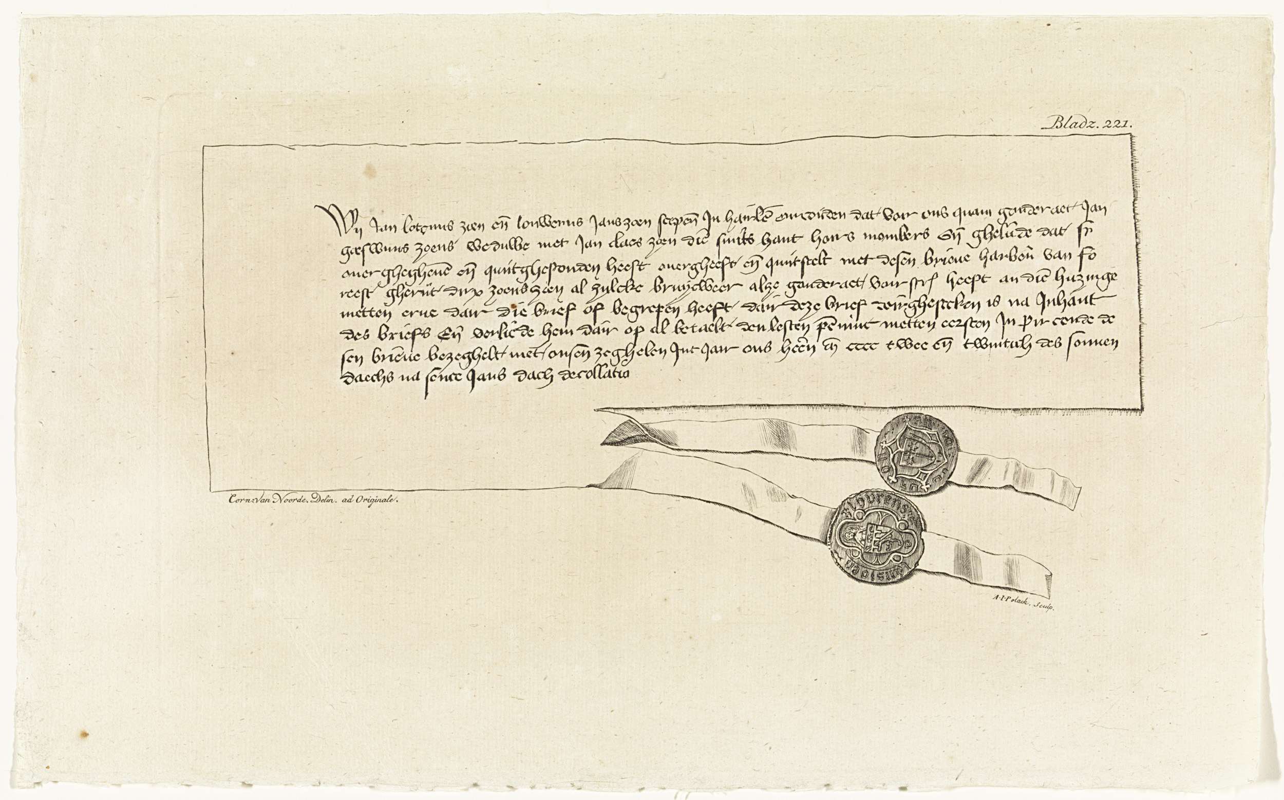 Acte met twee zegels, een van de stad Haarlem, de ander van de schepen Lauwerus Janszoen, getekend op de zondag na Sint Jansdag 1422. Een van de documenten gebruikt om het bestaan van Laurens Jansz Coster, de vermeende uitvinder van de boekdrukkunst, aan te tonen.