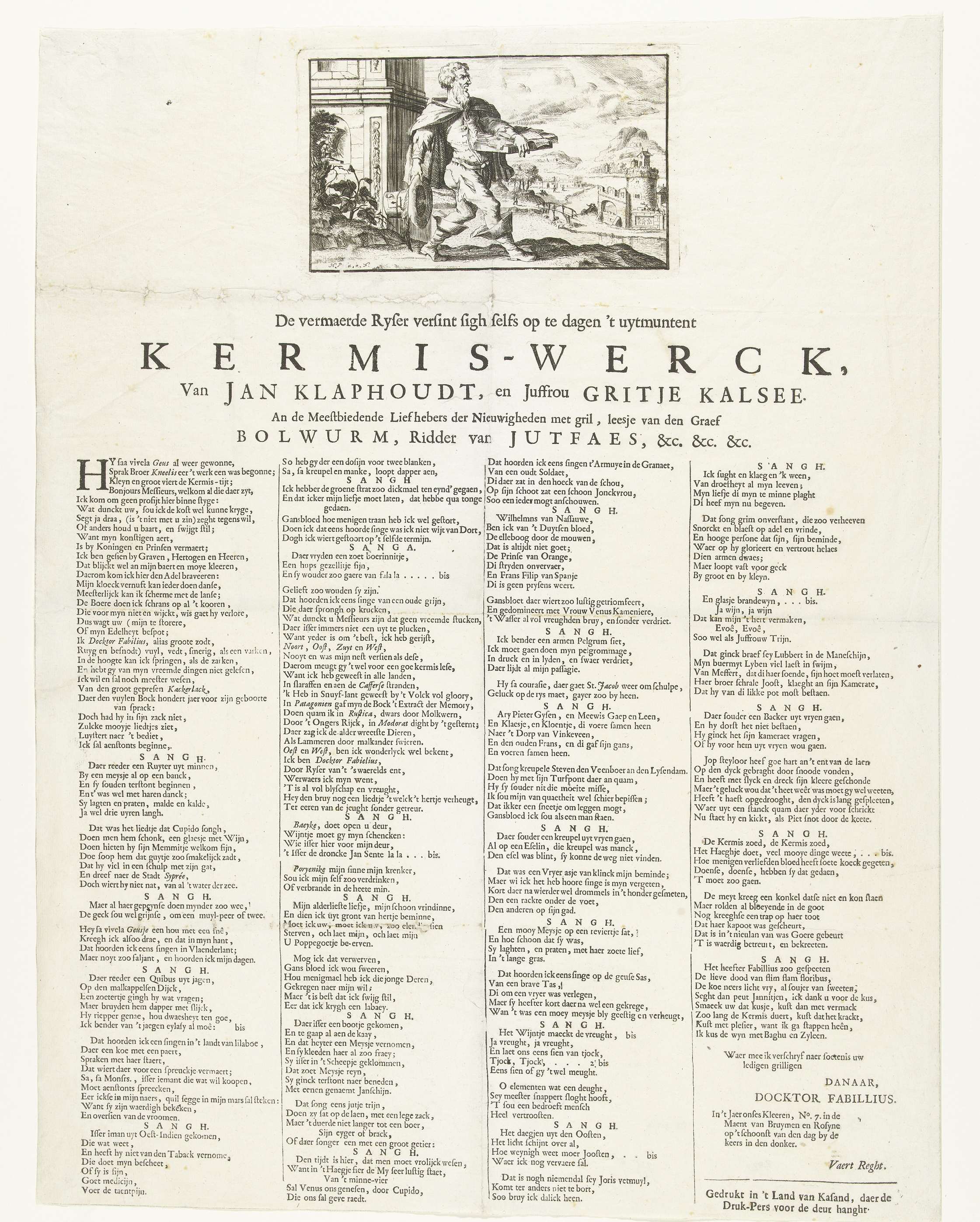 Kermisprent met een voorstelling van een pamflet- of prentverkoper. Gedrukt op het blad onder de plaat een lang spotvers over vrijen, drinken en zingen op de kermis, in het Nederlands in 4 kolommen.