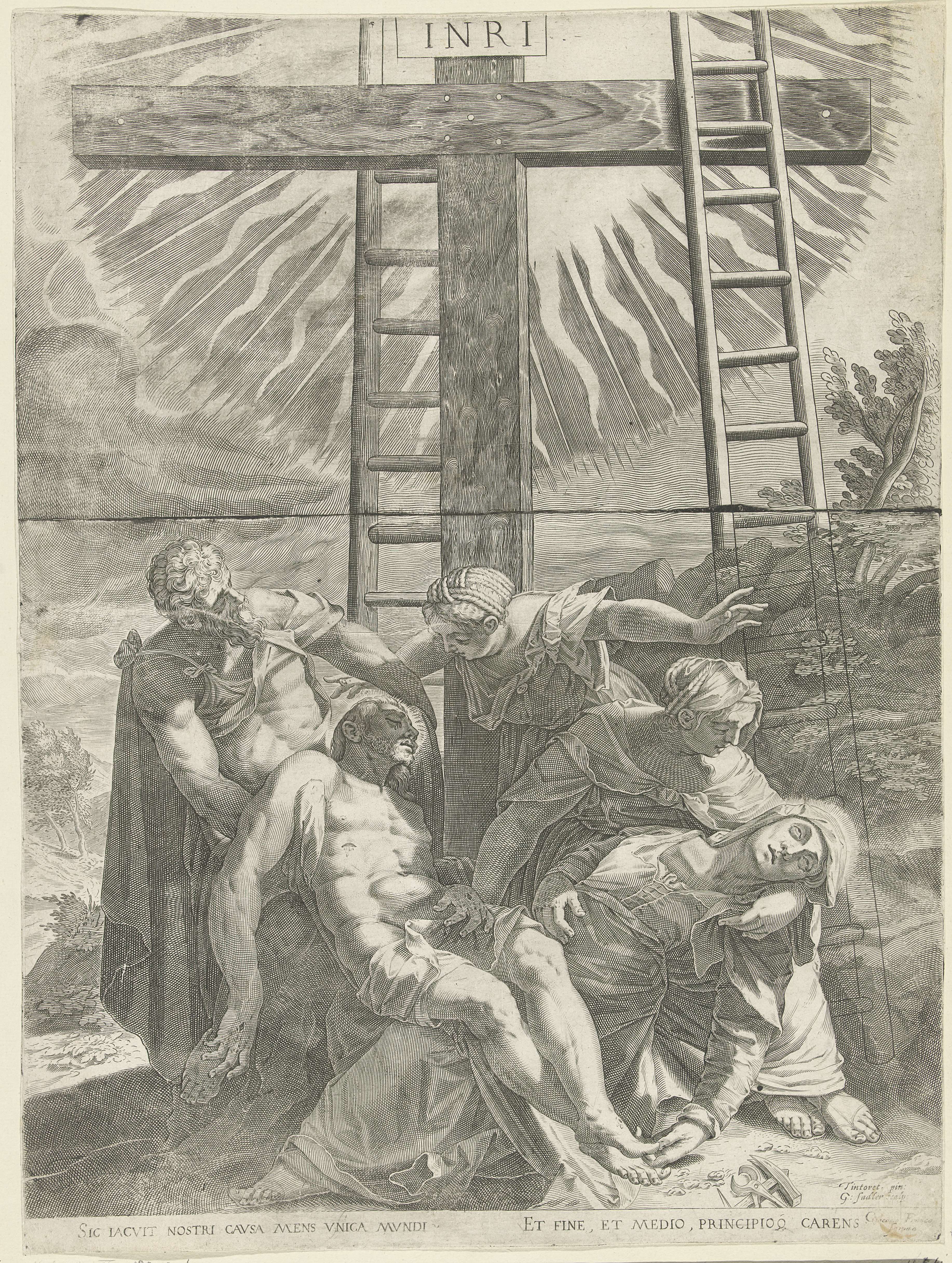 Christus wordt het kruis afgenomen door Jozef van Arimatea. Naast hem de drie Maria's. De maagd Maria is flauw gevallen. Tegen het kruis staan twee ladders. De prent heeft een Latijns onderschrift.
