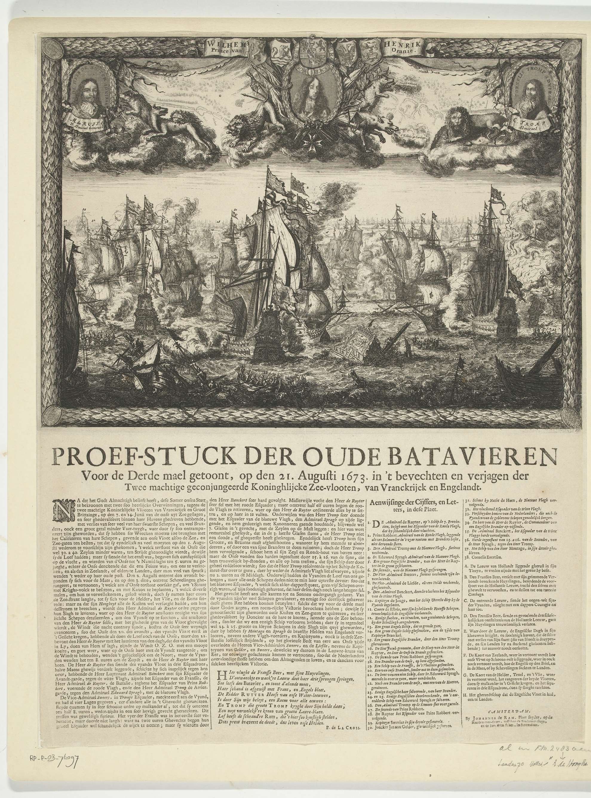 Zeeslag bij Kijkduin, 21 augustus 1673. Zeeslag tussen de Staatse vloot onder Michiel Adriaenszoon de Ruyter en Tromp en de gecombineerde Engels-Franse vloot onder prins Rupert. Boven de slag in het midden het portret van Willem III, links portret van De Ruyter, rechts van Tromp. Onder de plaat een tekstblad met beschrijving van de slag, ...