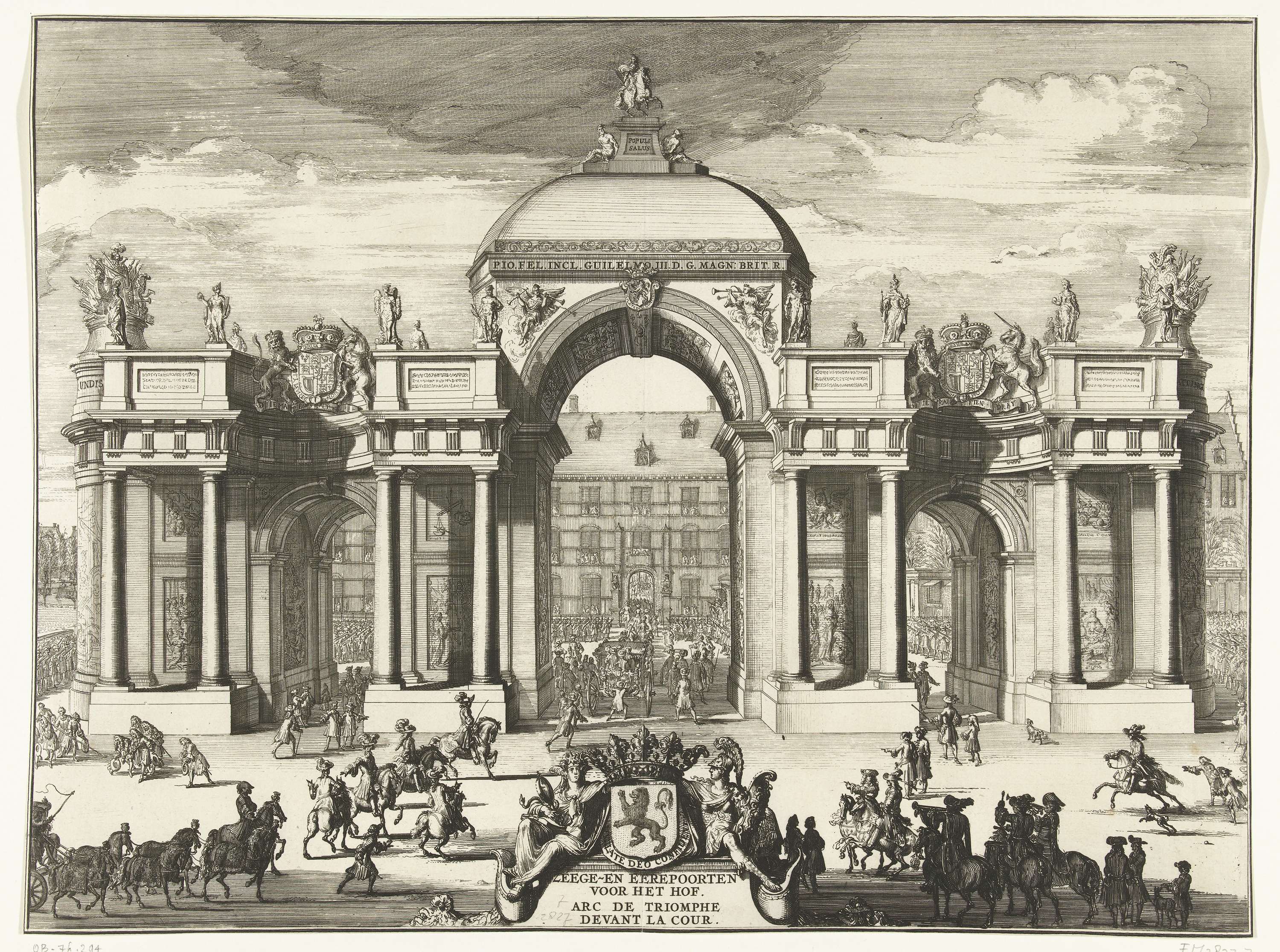 Gezicht op de triomfboog opgesteld bij het Buitenhof, 5 februari 1691. De stoet van rijtuigen is door de poort getrokken.