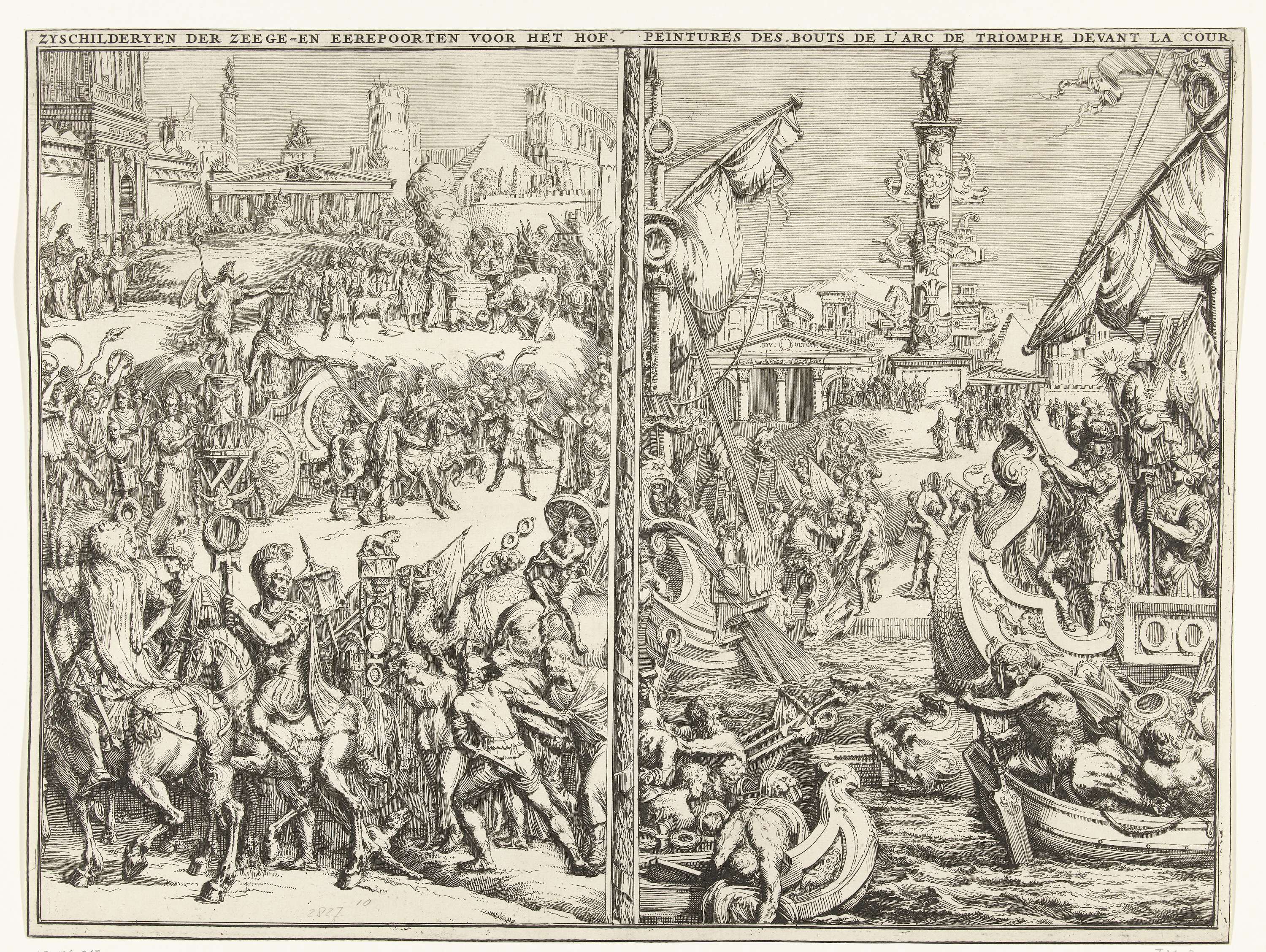 Twee schilderijen op de zijden van de triomfbogen opgesteld voor het Buitenhof, 5 februari 1691. Voorstellingen naar Romeinse voorbeelden met stadhouder-koning Willem III als triomferende held.