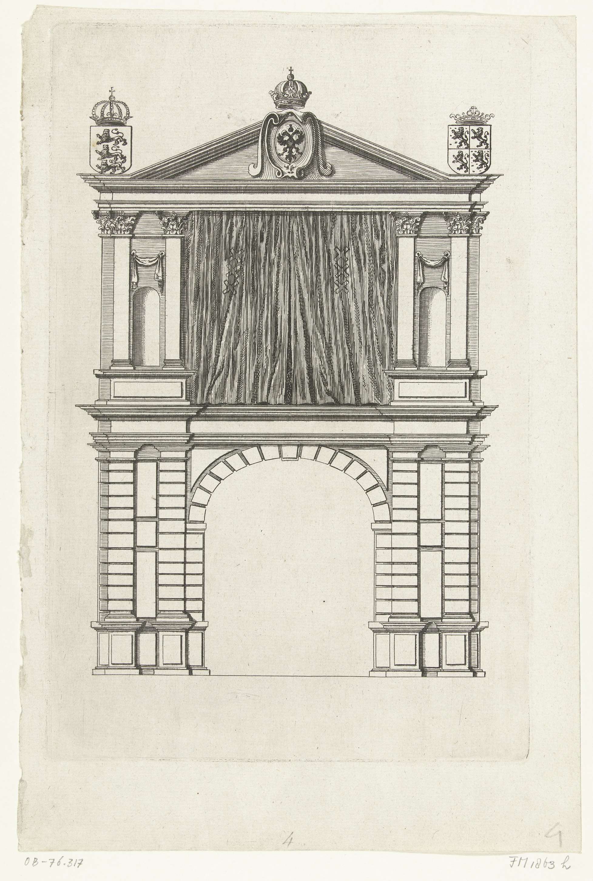 Theaterpoort opgericht op de Dam voor de Beurssteeg. Bovenaan het wapen met de adelaar van het Rooms-Duitse koninkrijk, op de hoeken de wapens van Engeland en Henegouwen, verwijzend naar de historische banden tussen Engeland en de Nederlanden. Toneel voor de vertoningen tijdens het bezoek van Engelse koningin Henrietta Maria aan Amsterdam, 20-22 mei 1642. Achtste ...
