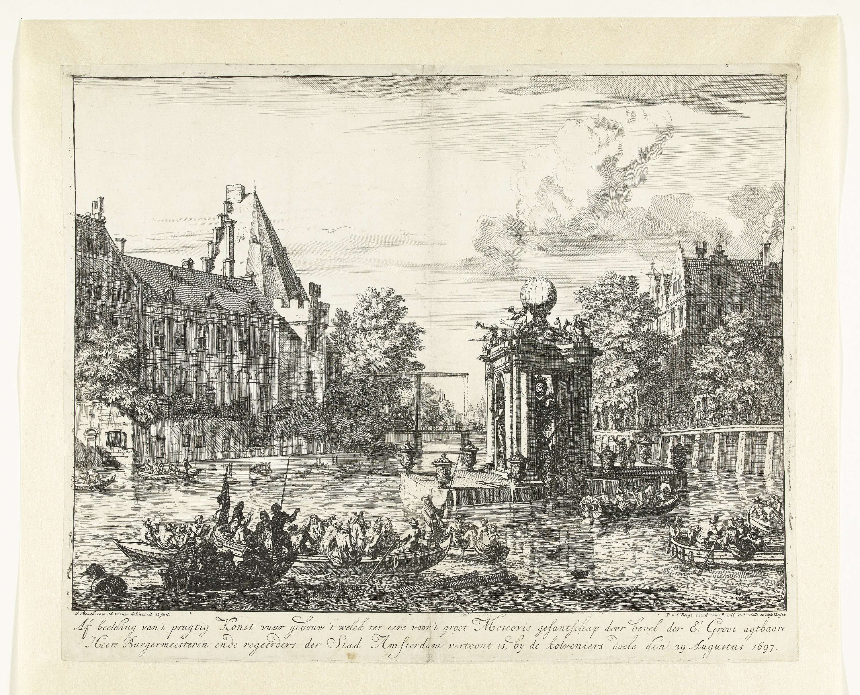 Gebouw voor het vuurwerk gegeven door het stadsbestuur ter ere van het bezoek van het Russisch gezantschap met tsaar Peter de Grote aan Amsterdam, 29 augustus 1697. Stellage opgericht in het water bij de Kloveniersdoelen en Kloveniersburgwal.